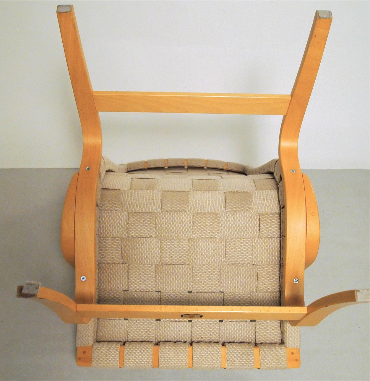 Bruno Mathsson, "Eva", made for the 60th anniversary in 1994, numbered. Bent wood in beech, upholstery of saddle girth, brand-marked and tag-marked. Seat height approx. 38 cm.