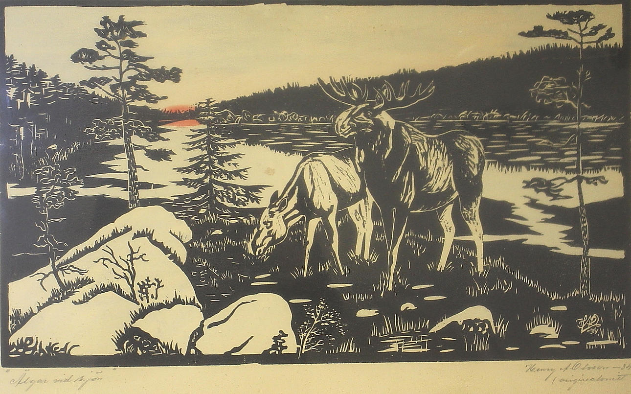 HENRY A OLSSON. original cut "Elks by the lake" signed, dated -34.