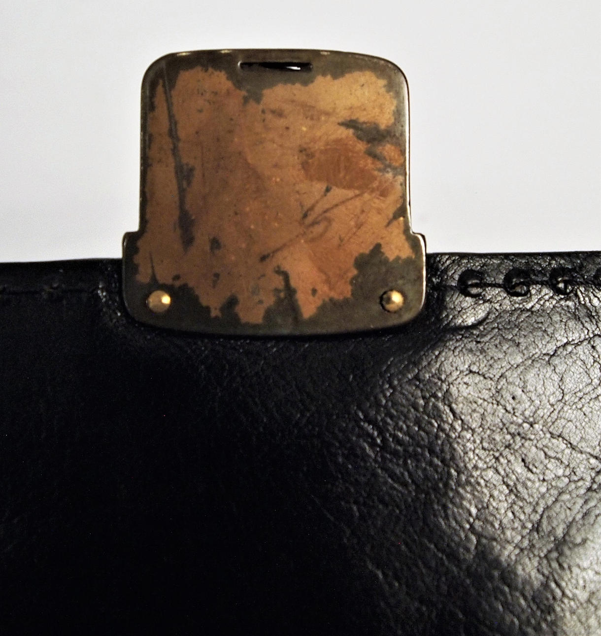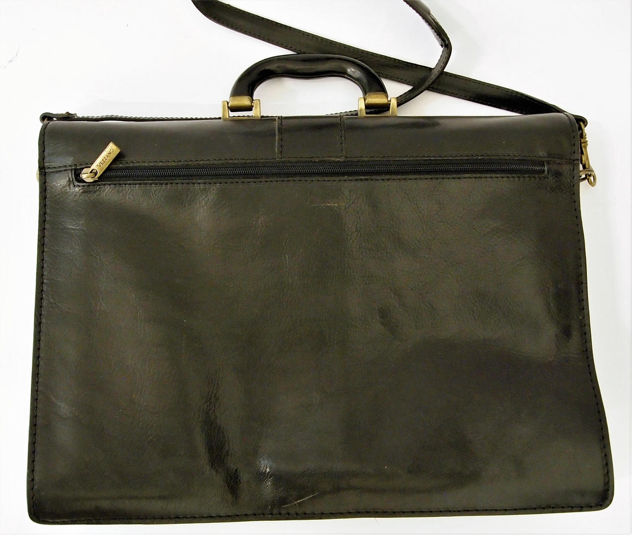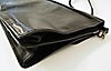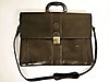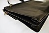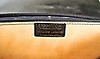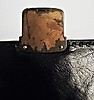 Black leather, brass colored details, shoulder strap. 42 x 32 x 12 cm.