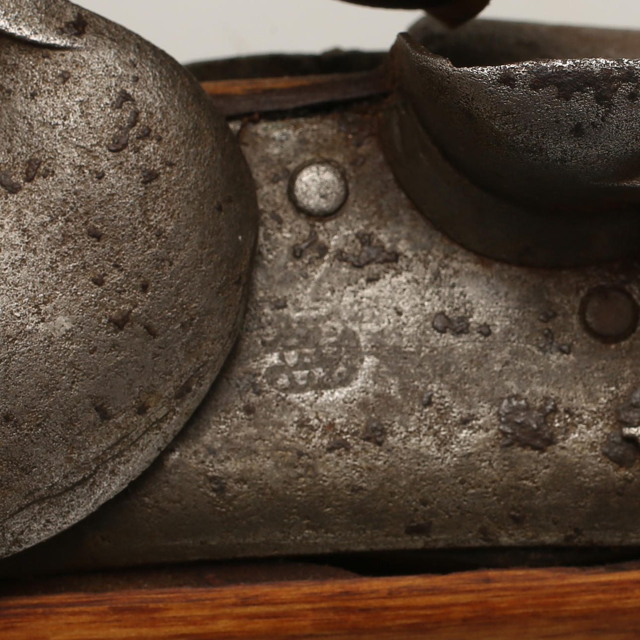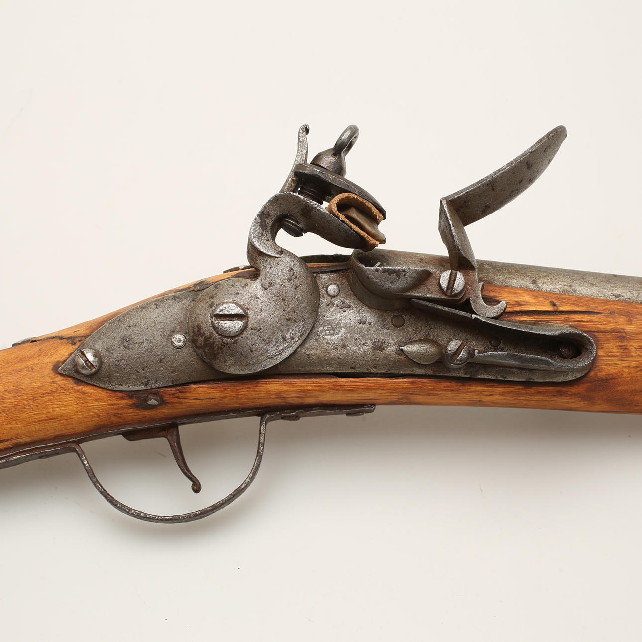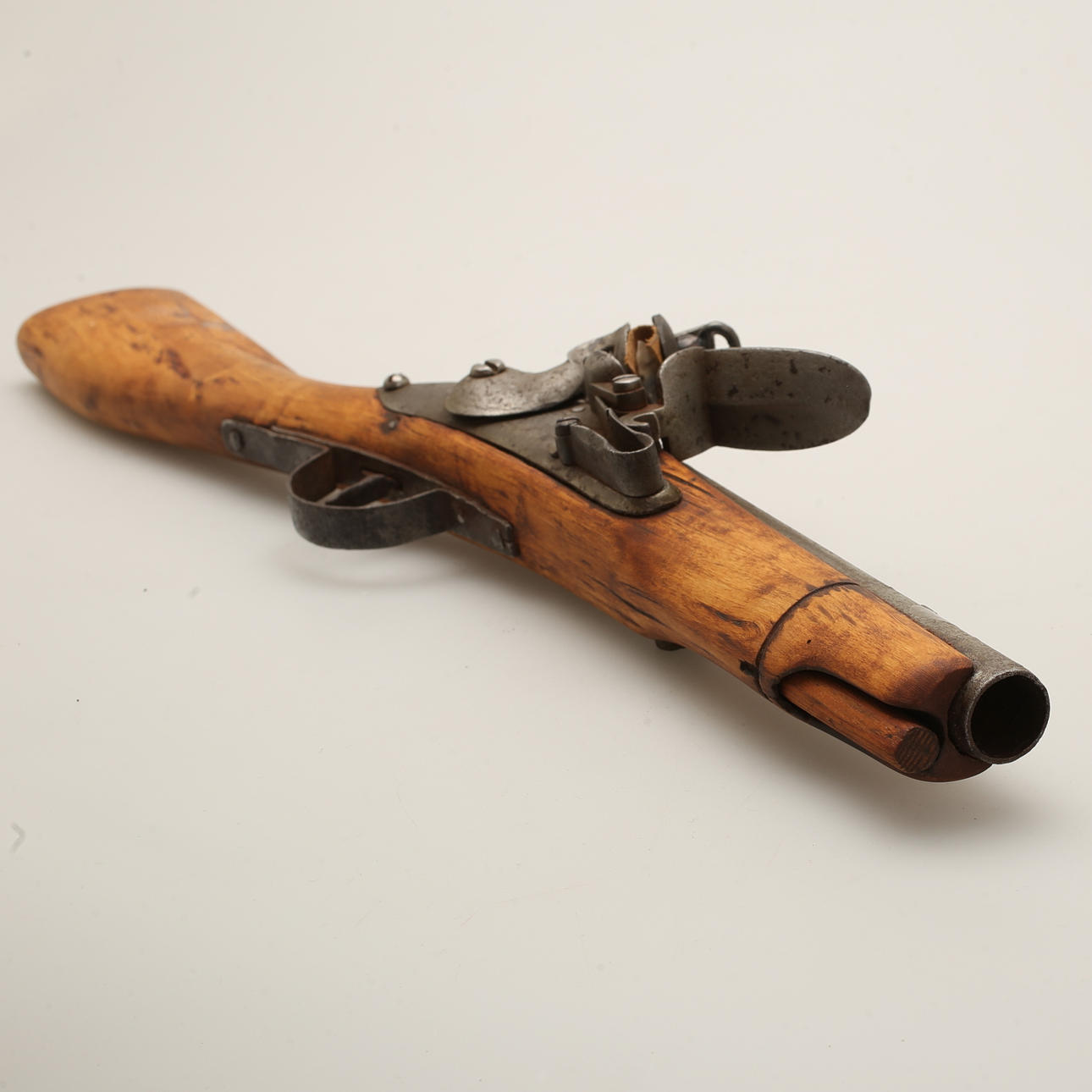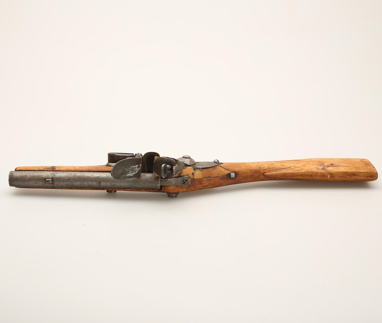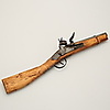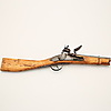 Probably wolf rattle that was used for predator skulls. Early 19th century with musket lock from the early 18th century. Alternatively, sledgehammer. Log in birch. Lock works.