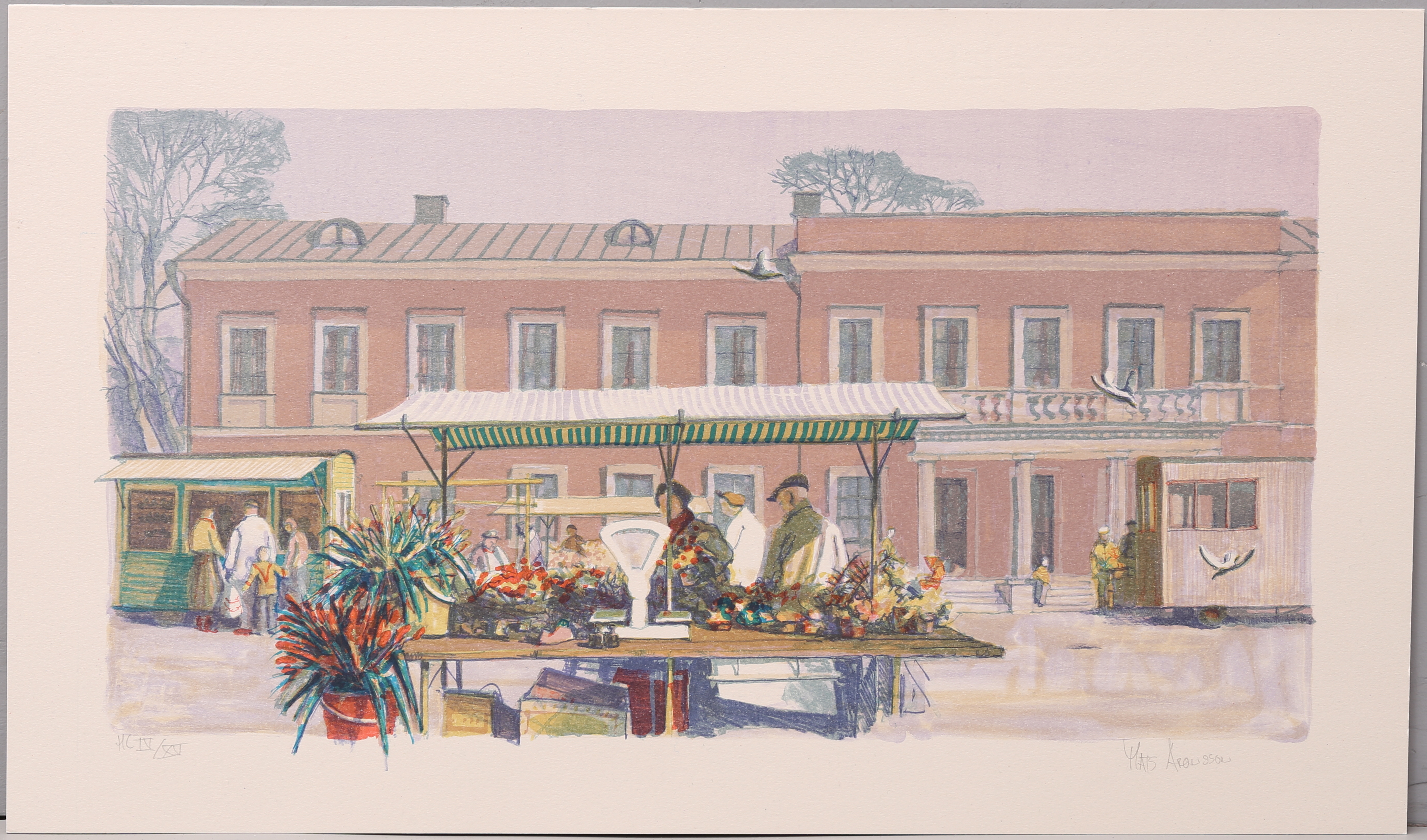 1044421. MATS ARONSSON. Market trading. Color lithograph, signed and numbered HC IV/XV.
