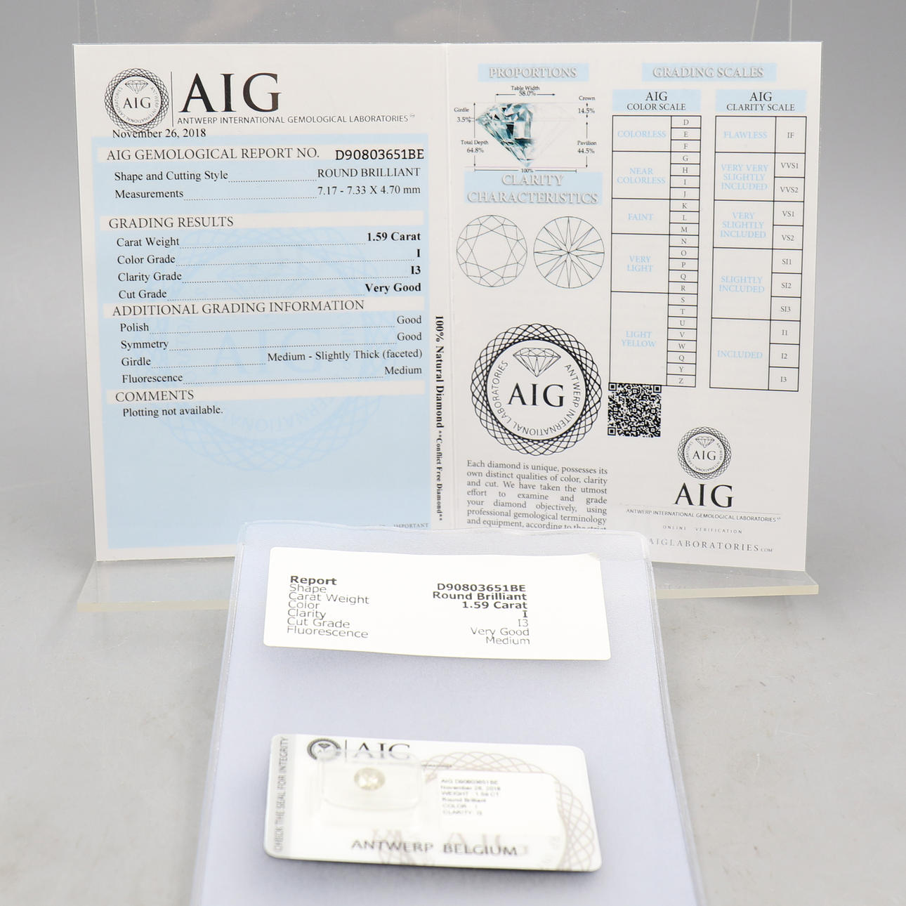 DIAMOND, 1.59 ct, AIG certification.