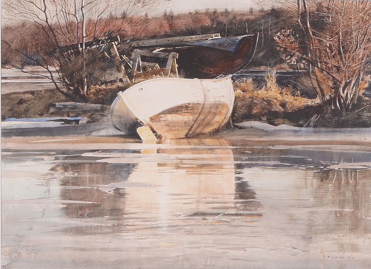 Beached boat. Signed and dated -94. 37x50 cm.