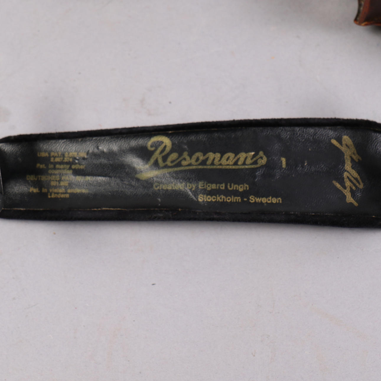 Length 60 cm Case, bag, 2 strings with mother-of-pearl details Stödsammetklätt and marked Resonans, created by Elgard Ungh, Stockholm, Sweden.