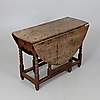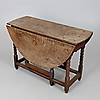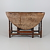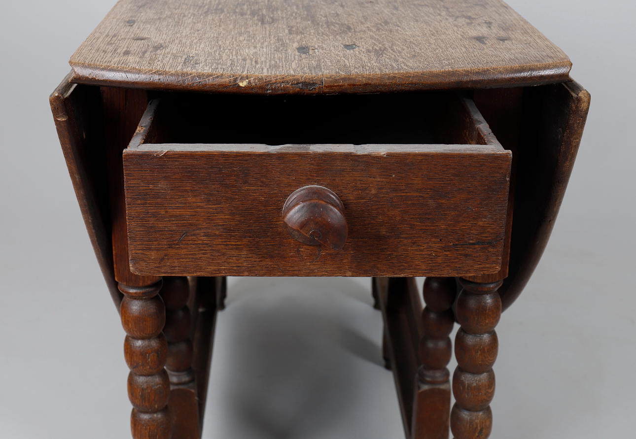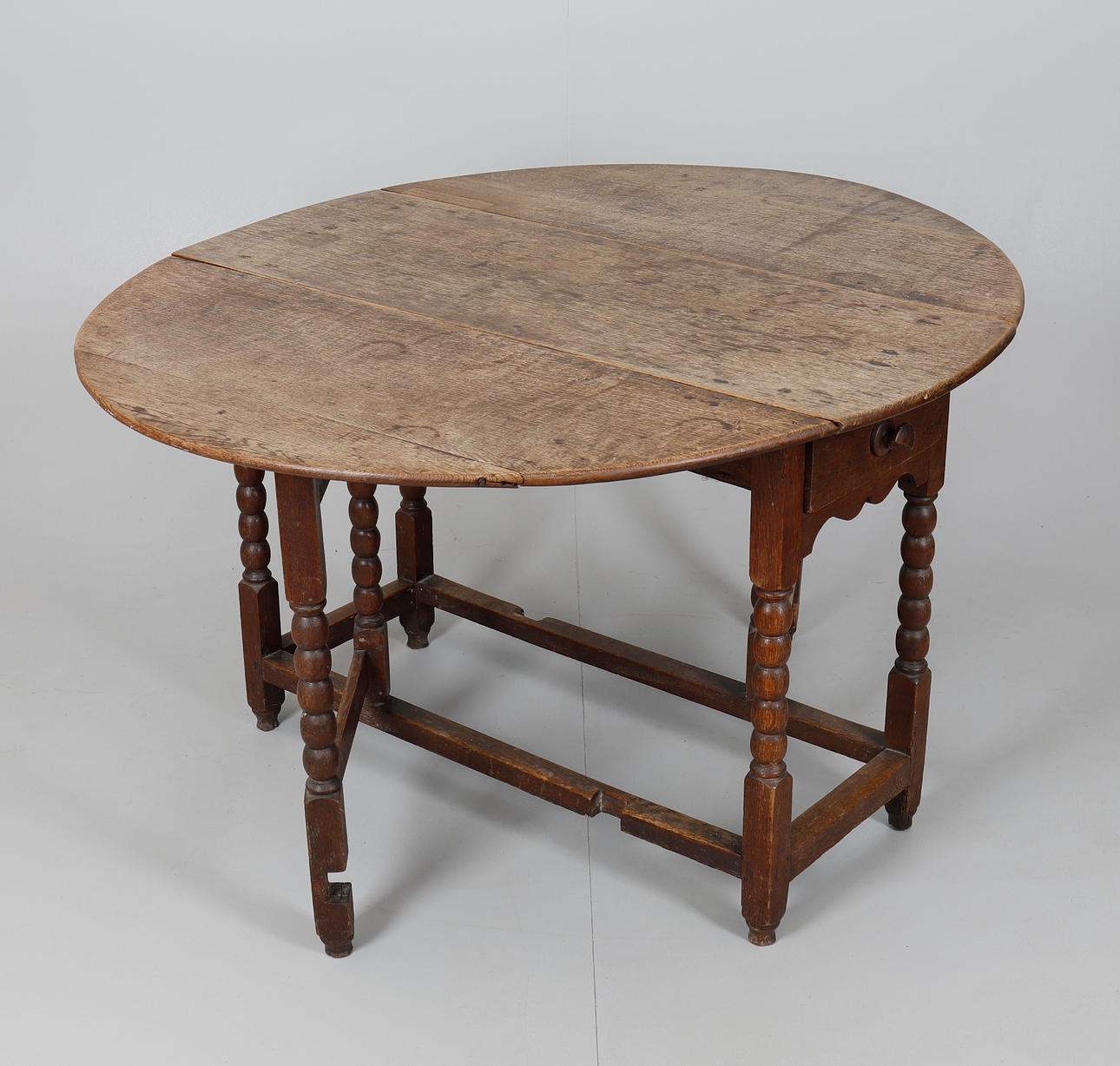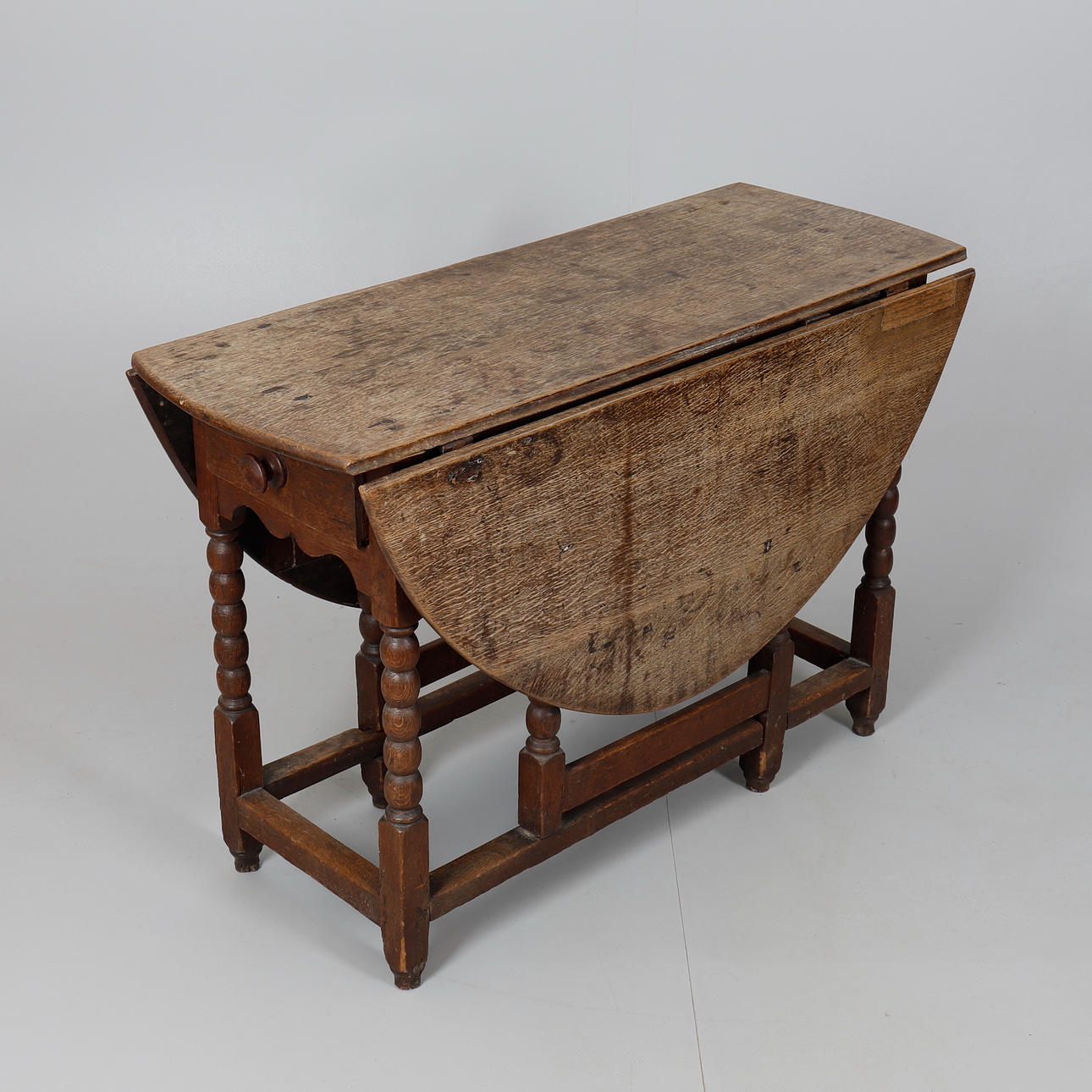 Marks, knocks, scratches, abrasions consistent with age and use, faded overall, one leaf with inset timber at the hinge, marks and stains including ringmarks, the drawer with later knob handle, this is broken with just under half missing, some areas of stained filler to top where pegs secure to the frame, some later timber and metal bracing to undersides.