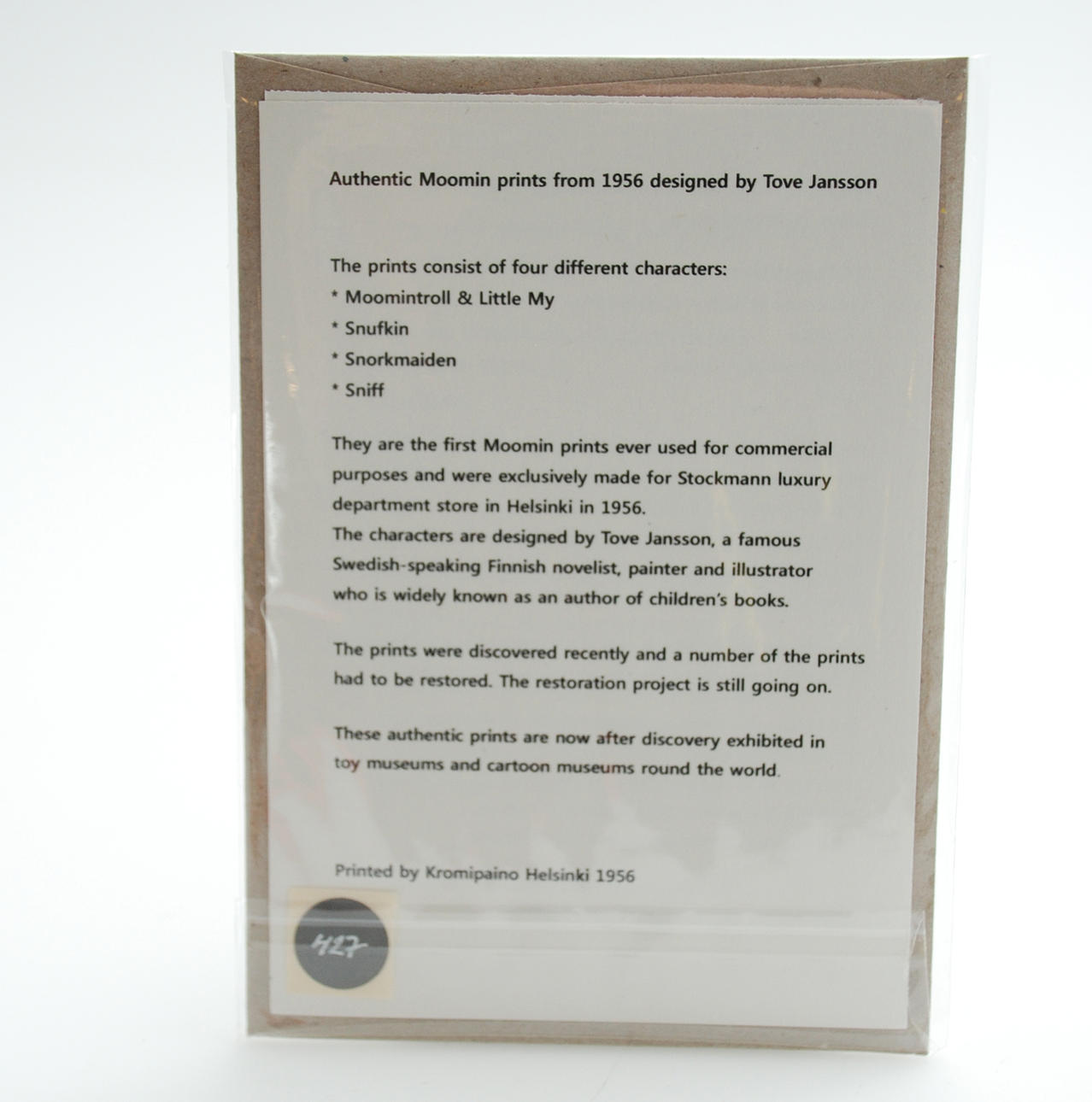 size with passpartout 15x10.5 The prints consist of four different characters: Moomintroll & Little My Snurkin Snorkmaiden Sniff They are the first moomin prints ever used for commercial purposes and were exclusively made for Stockmann luxury department store in Helsinki in 1956.