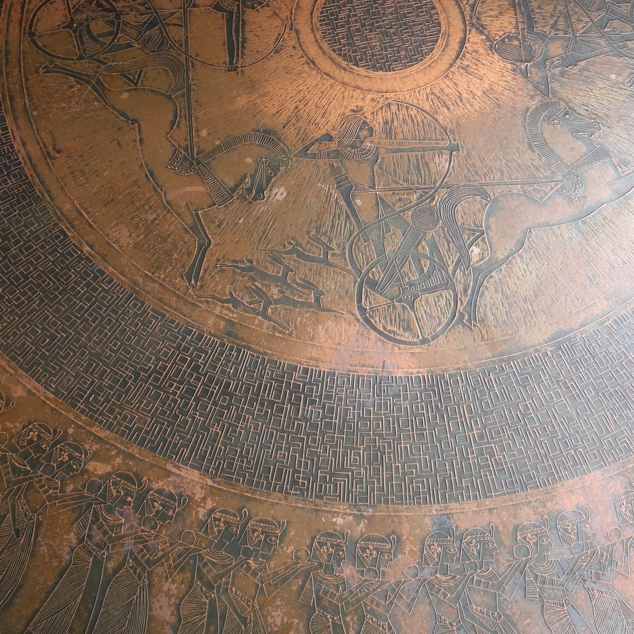 The plate in copper with decoration from ancient Egypt. Diameter 112 cm, height 54 cm.