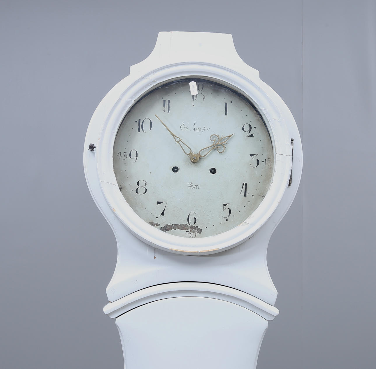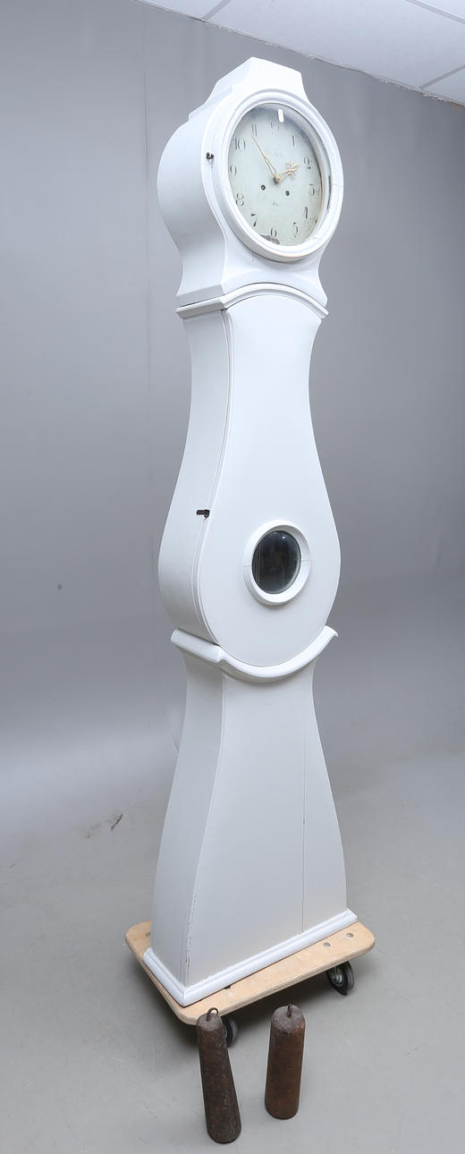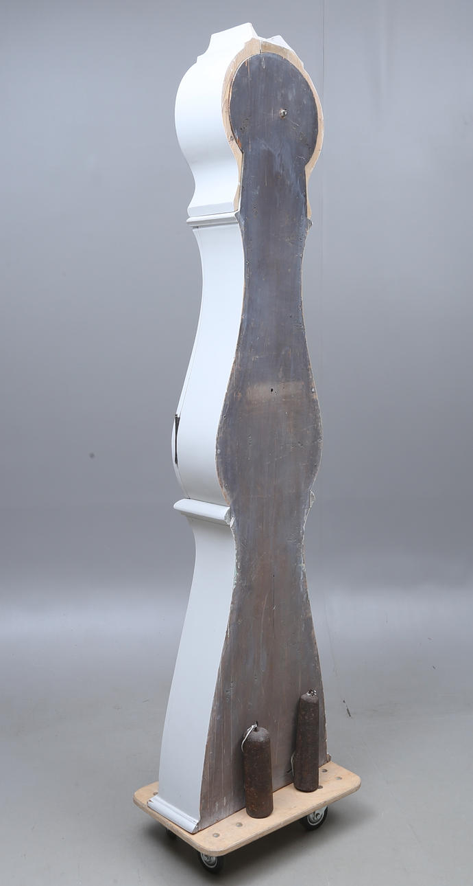 Renovated and supplemented. Hood probably later. Dry cracks. Later painting with loss of color. Pendulum and plumb line available.