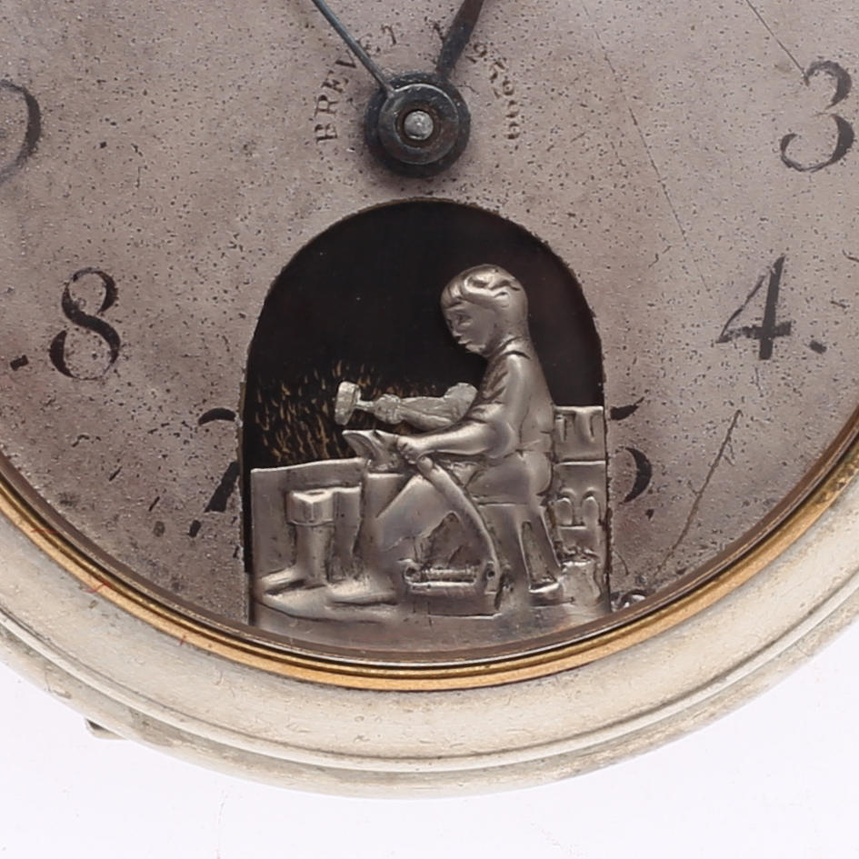 With a small cobbler embedded in the dial that should hit with a hammer. Diameter 51 mm.