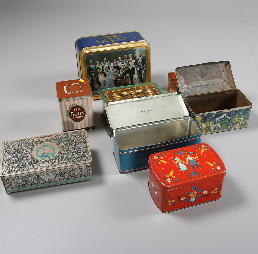 110131. A Collection, 9 Tin cans 20th century.
