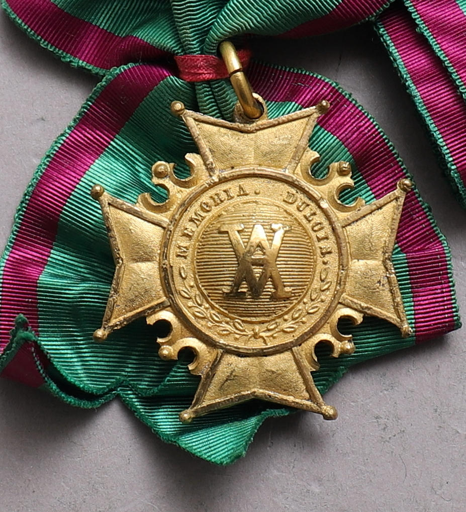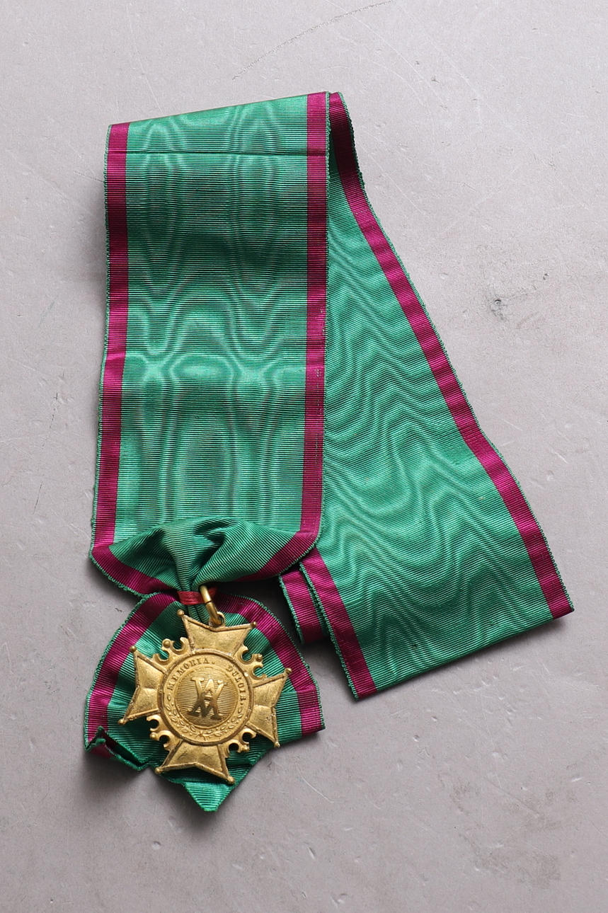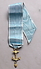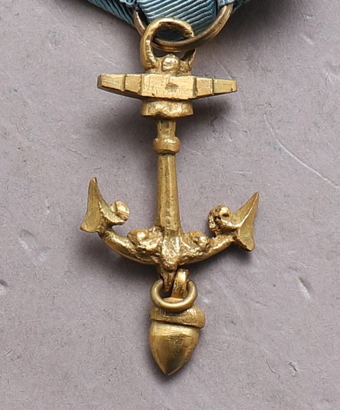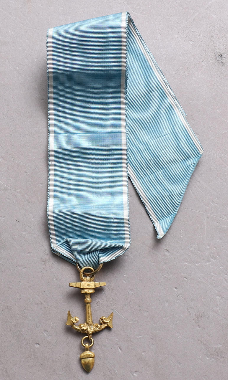 "The Perfect" - Badge in green ribbon with amaranth red edges. Worn over the right shoulder and against the left hip inside the frock coat. Length with ribbon approx. 66 cm, length of medal approx. 5 cm "The Faithful" - Anchor in light blue ribbon with silver edges, bow. For heralds only. Length approx. 30 cm, length of medal approx. 4.5 cm.