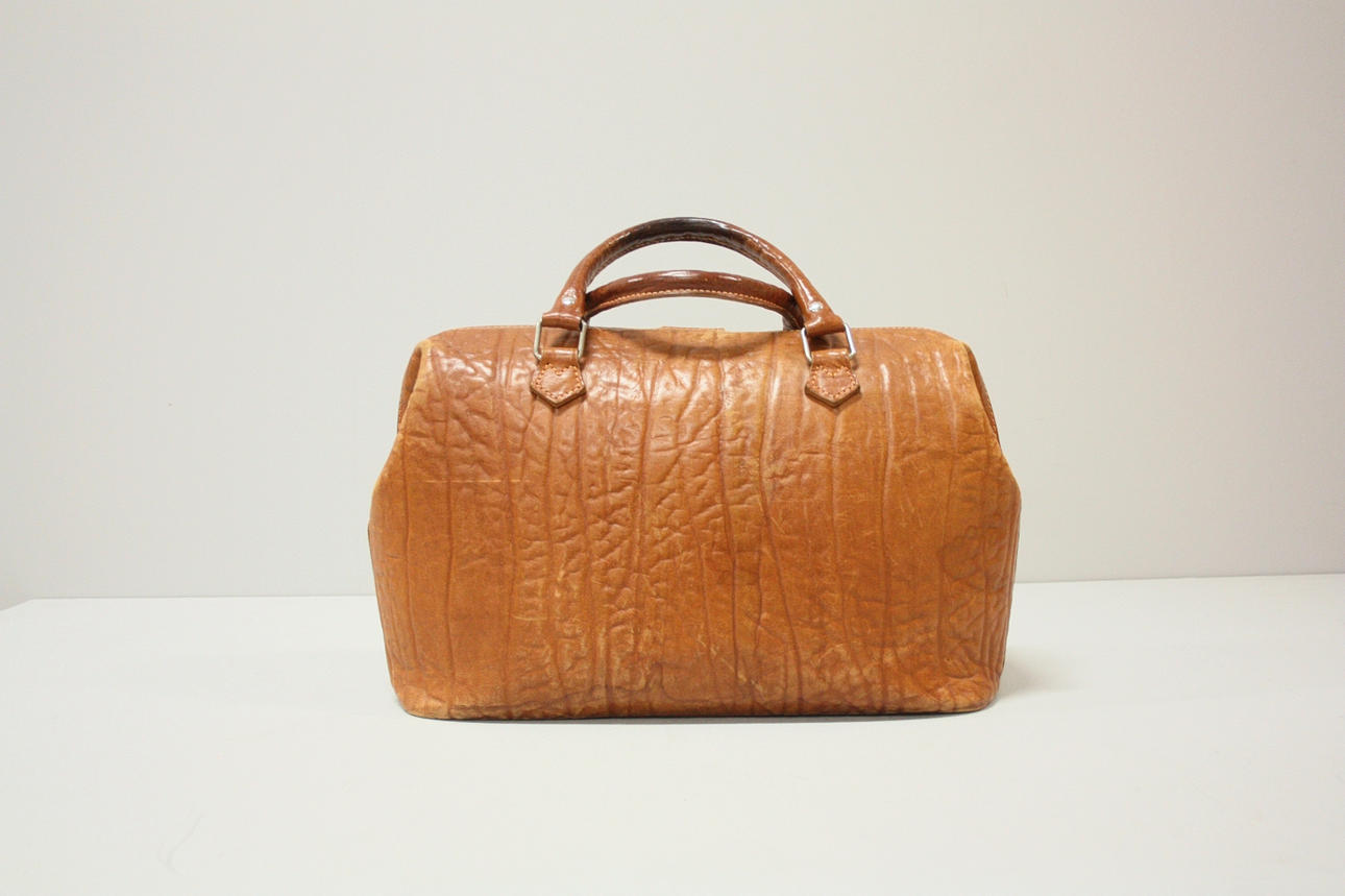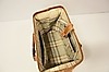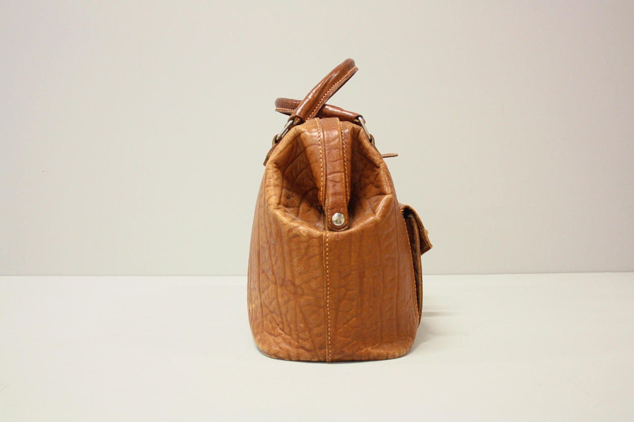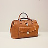 Bag in brown leather, fittings in metal. Lined in checked textile, one external compartment and two side compartments inside. Handle.