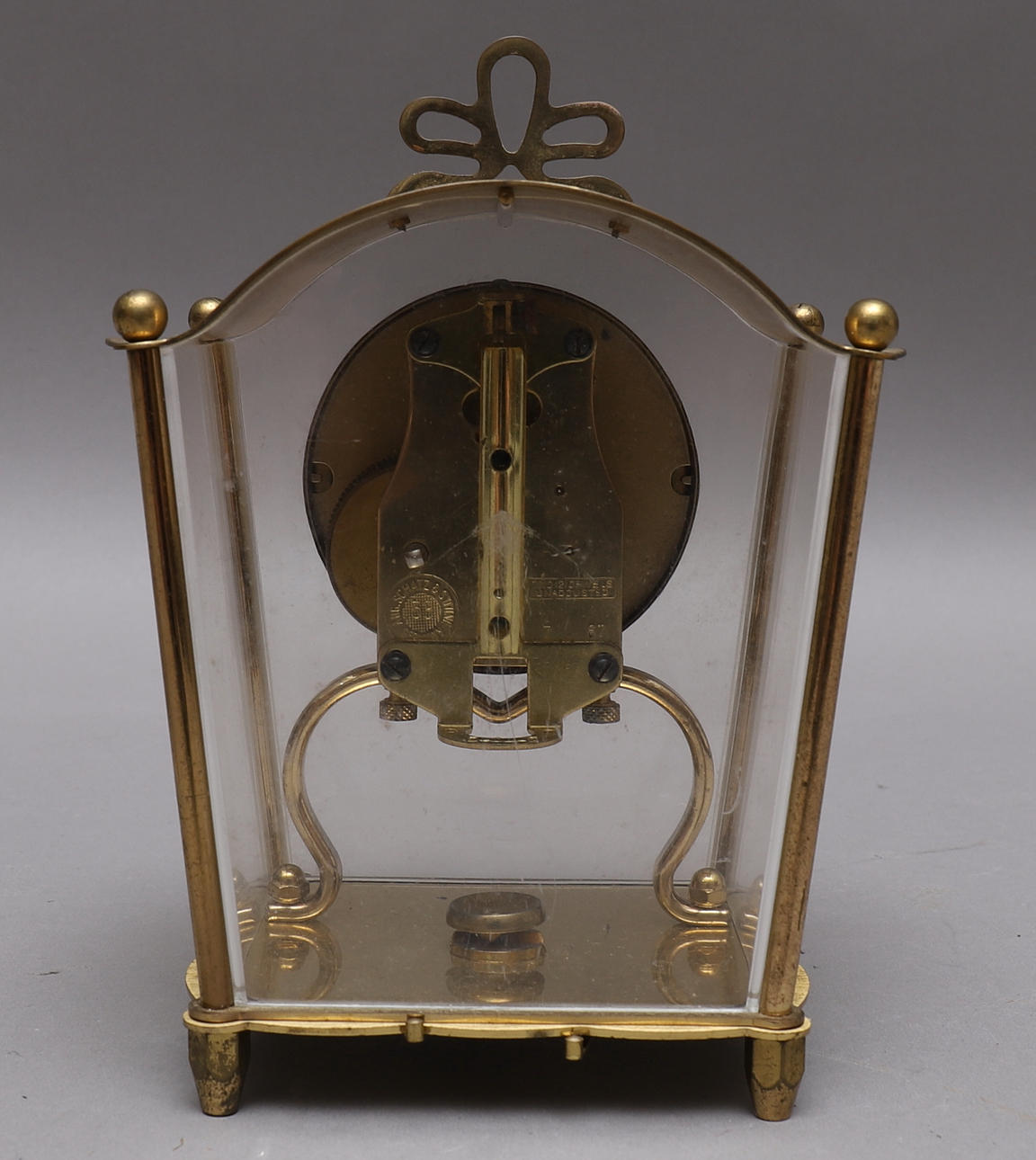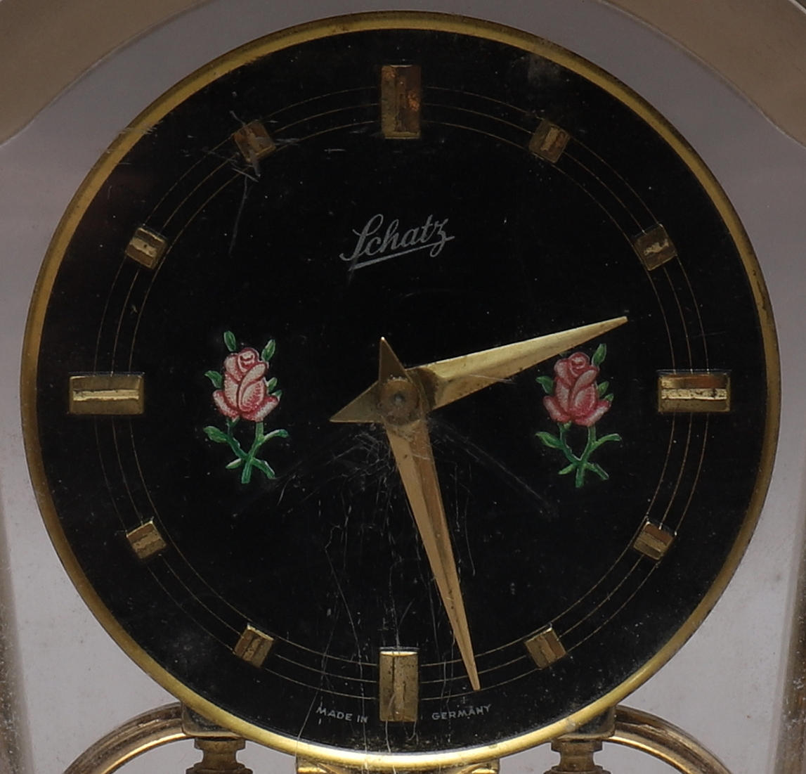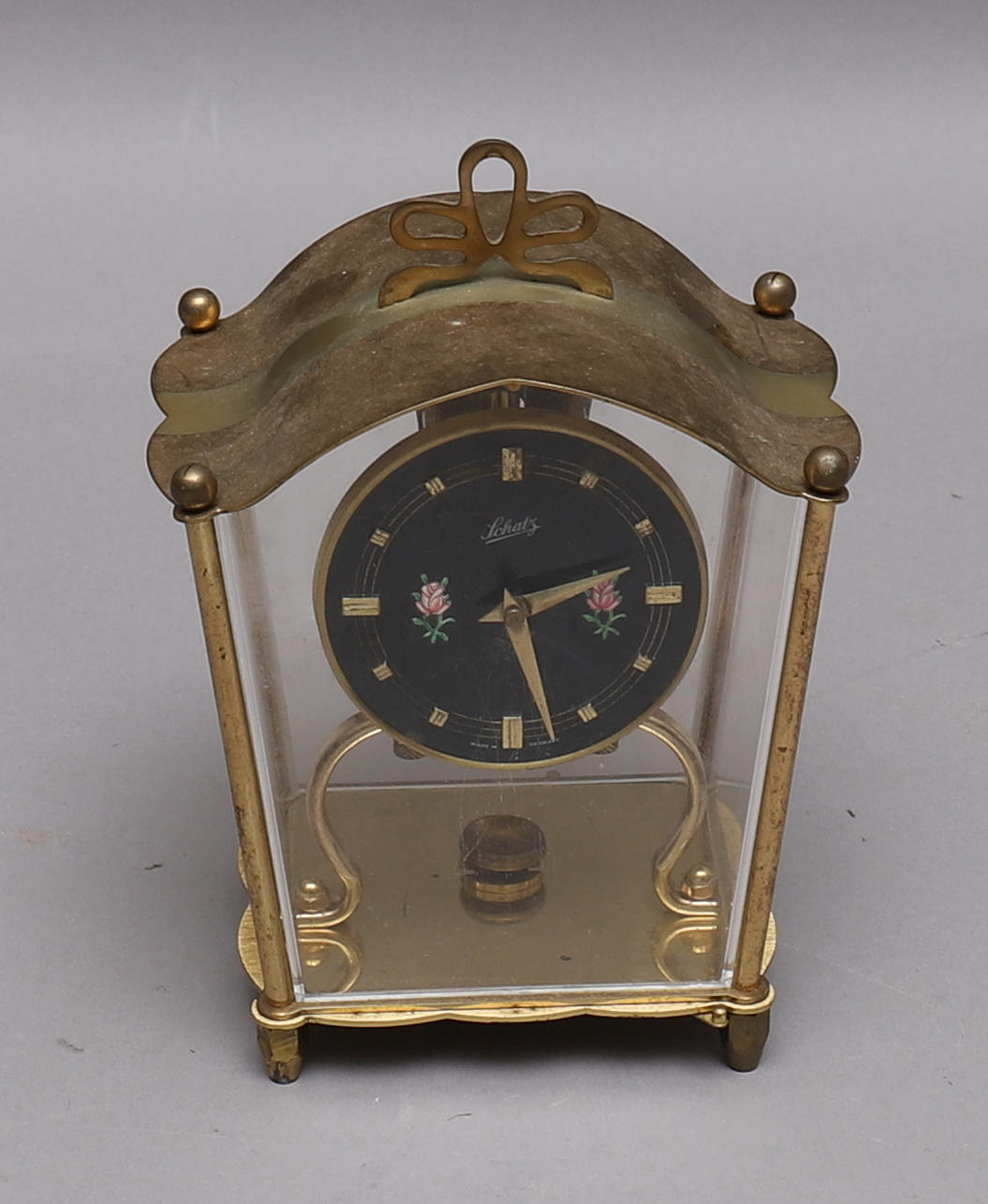 1108629. TABLE CLOCK, brass/glass, Schatz, manual.