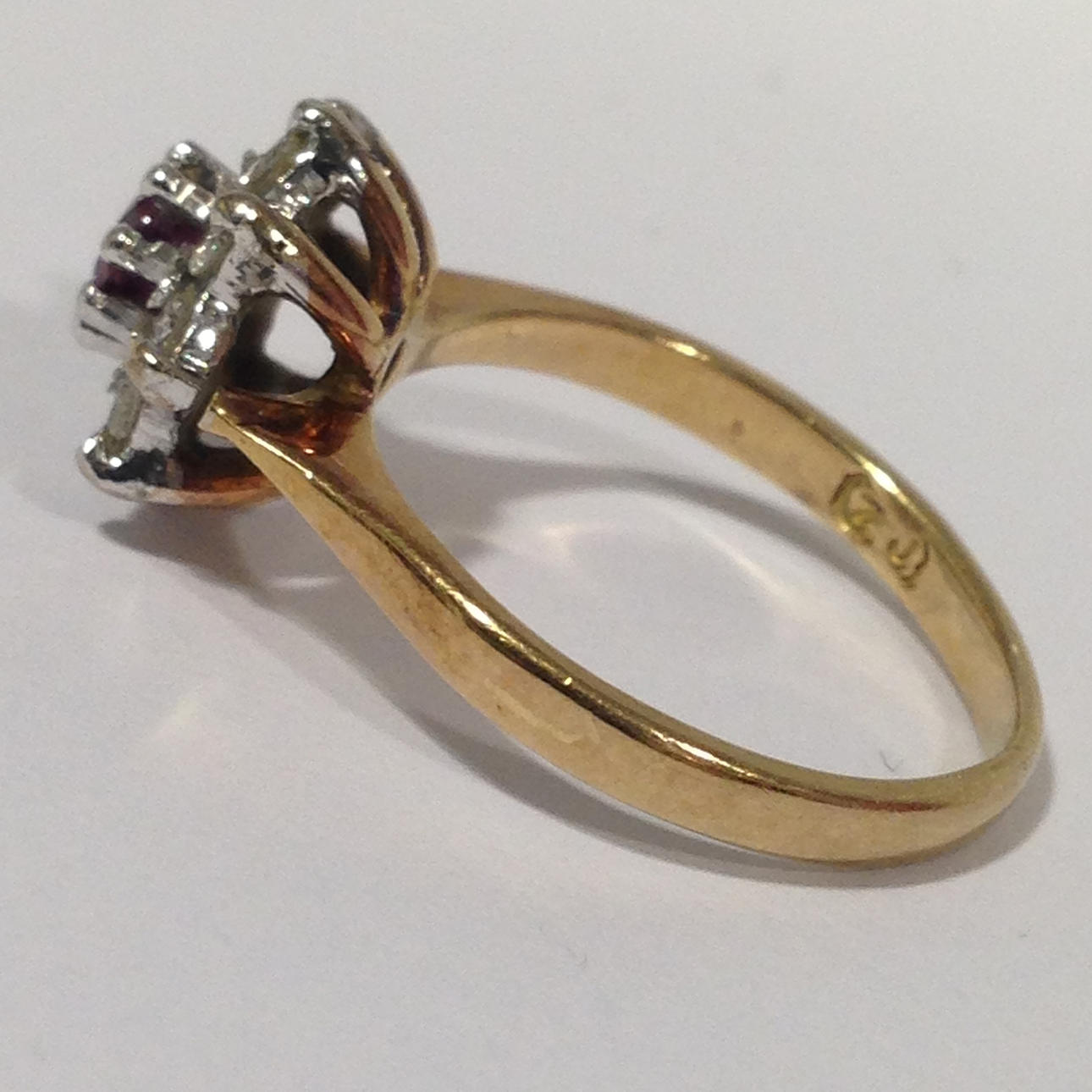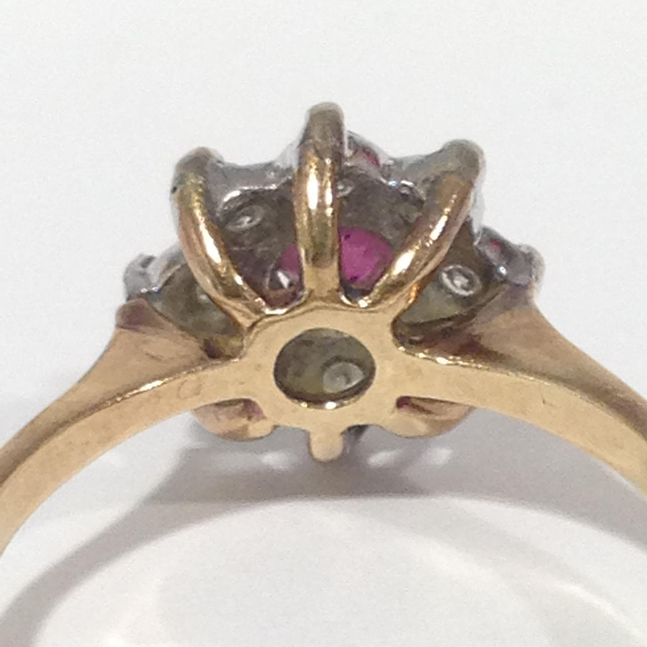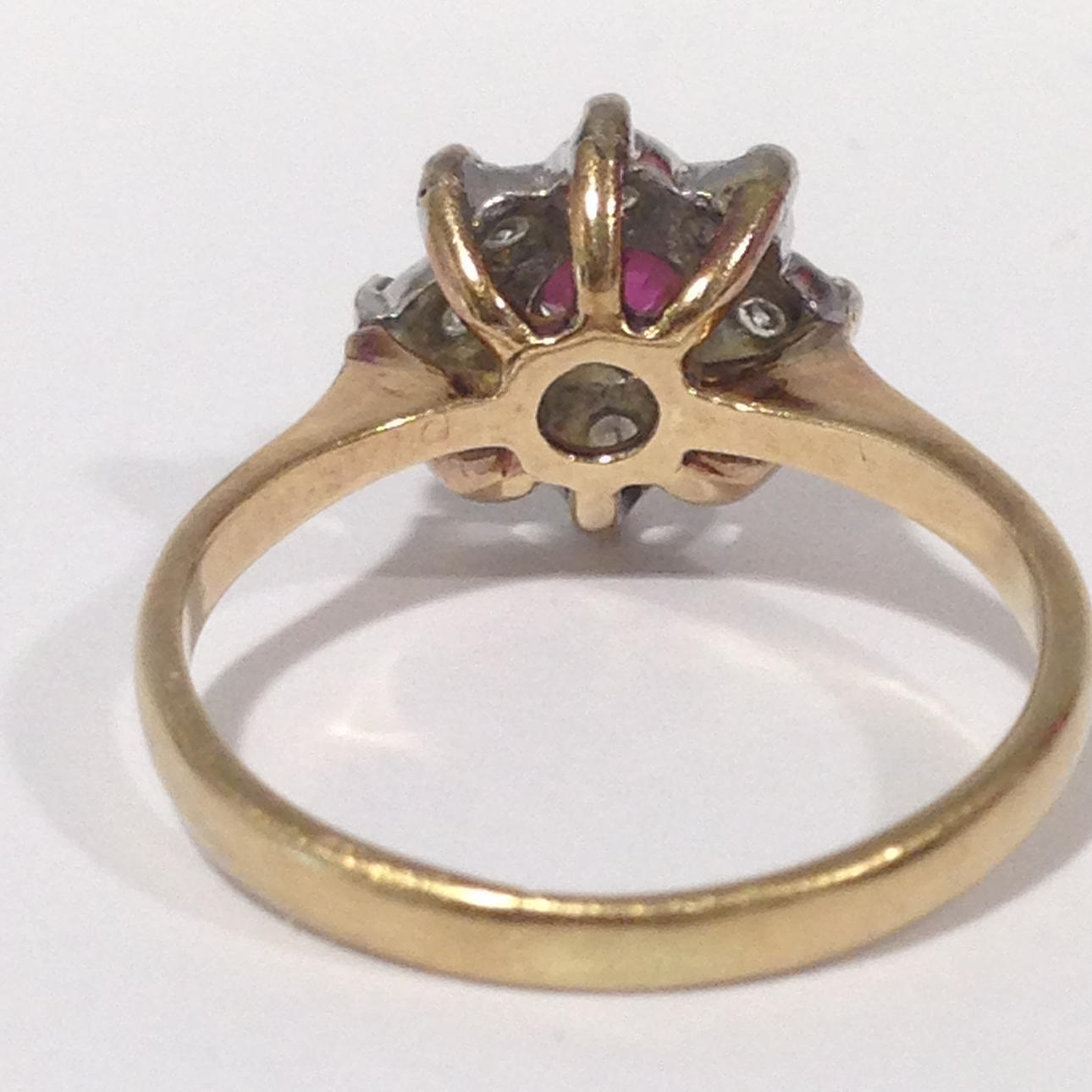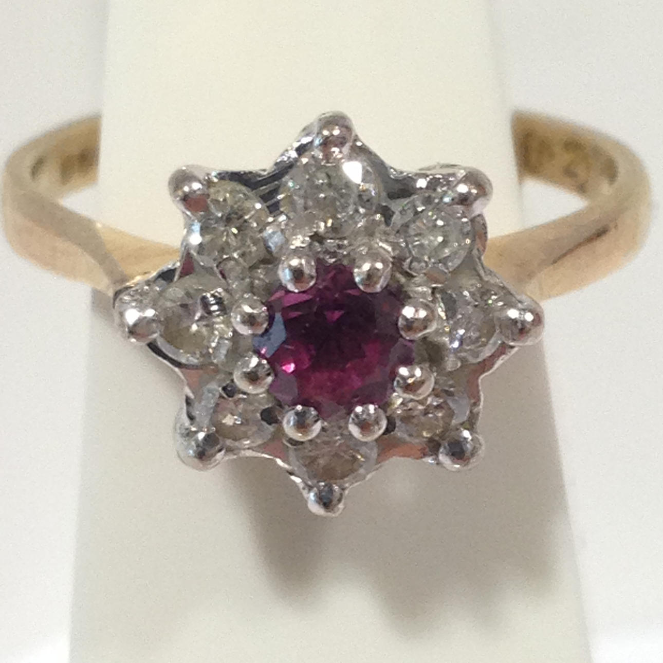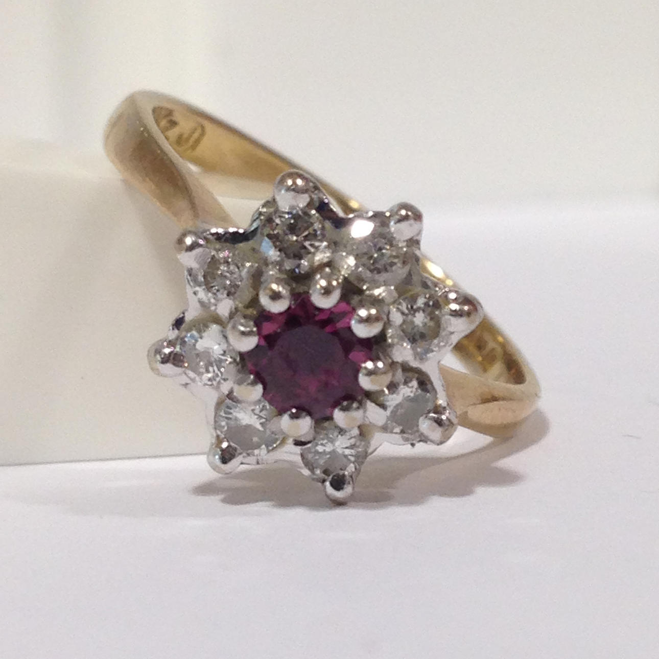 A cluster ring set with ruby and diamonds in 18k yellow gold (hallmarked).