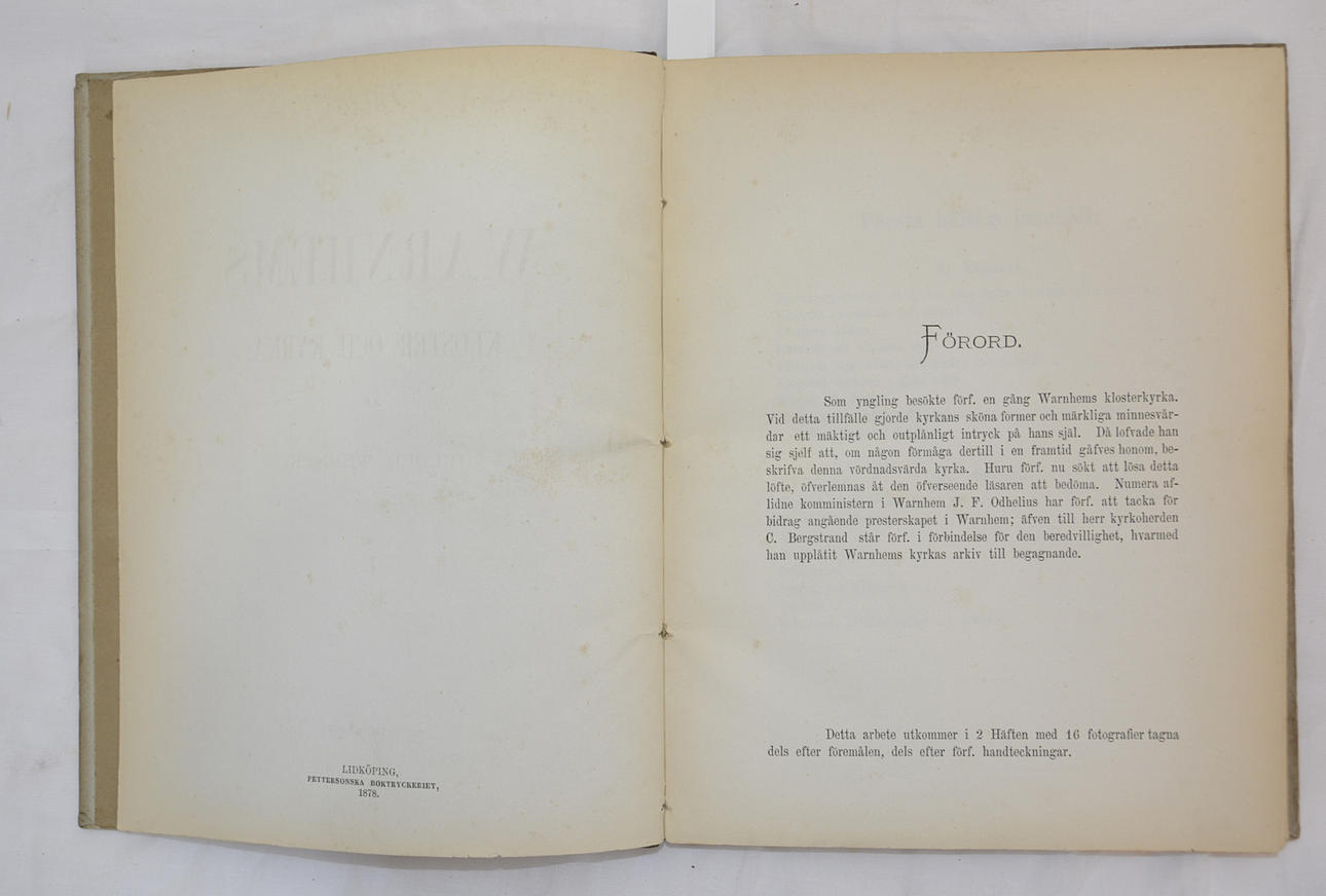 - II. -With 4 panels. 64 pp., 4 lithographic plates numbered X-XIII. Lidköping, Joh. Isaksson's Boktryckeri, 1881. (The numbering of the plates actually contradicts the "tenth photo", but the two parts were printed 3 years apart and at different offices, which is why mistakes may have been made). 2 original cloth spines with print on front covers. Very good condition! Stored in a special heavy brown capsule with the title in gold on the back. Bookplate 'Sven Olof Löfving' on the inside of the front cover in both volumes. A very nice example. of this rare work!
