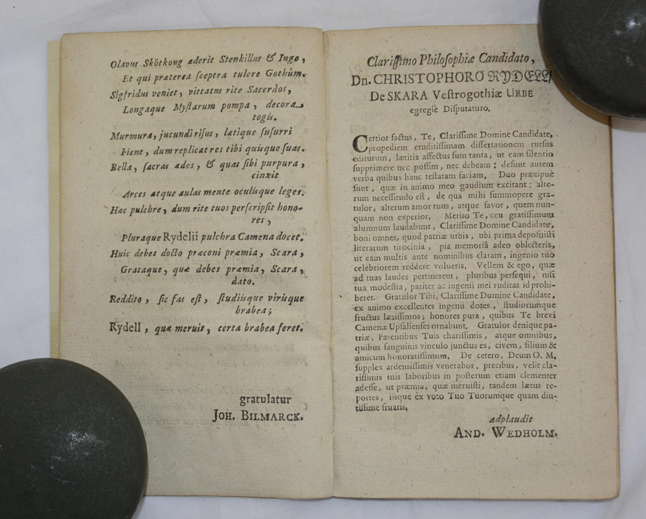 RYDELL, CHRISTOPHORUS. Quam Conscentiente Amplissima Facultate Philosophica, sub Præsidio Admod. Reverend atq; Celeberrimi Viri Dn. JOANNIS STEUCHII S. S. Theol. Doct. Log. & Metaph. Prof. Reg. & Words. Dissertatione Graduali breviter delineatum publico examine submittit S:æ R:æ M:tis Alumnus Christophorus Rydell, V. G. In Audit. Gustav. May, ad diem 11 Junii Anni MDCCXIX horis ante meridiem solitis. Upsaliæ, Typis Wernerianis. (Uppsala 1719). (6), 52 p.