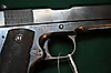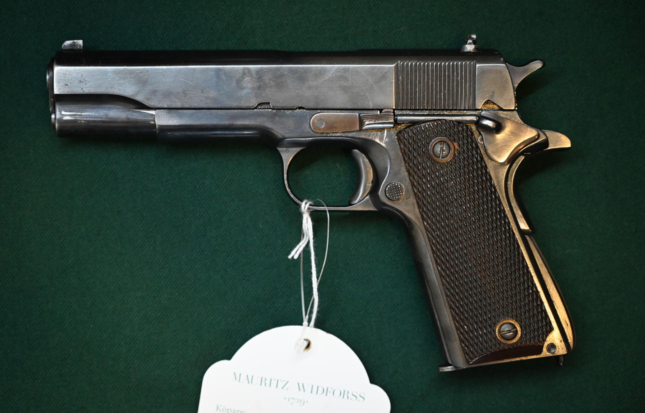 Caliber 45Acp. Tel. no. 1493457. Barrel length 12.5 cm. Fixed aim. Detachable magazine. Pistol cord ring. Piston sides made of brown bakelite. Holster included.