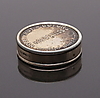 Silver box, manufactured by Hallbergs Guldsmeds AB in Stockholm in 1941 "Krystallos, Nobel powder - Bofors, 450 times sweeter than sugar" Stamped CGH, Stockholm, cat's foot, S, P8 Diameter approx. 4.5 cm Weight 19.5 grams.