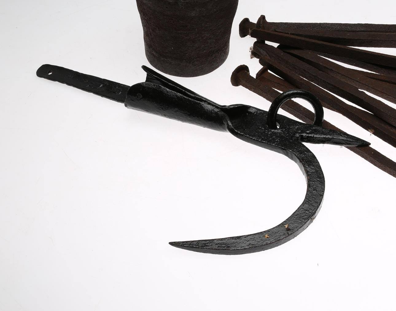 1138301. HOUSEHOLD TOOLS, iron nail, hook and mortar.