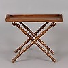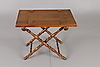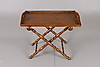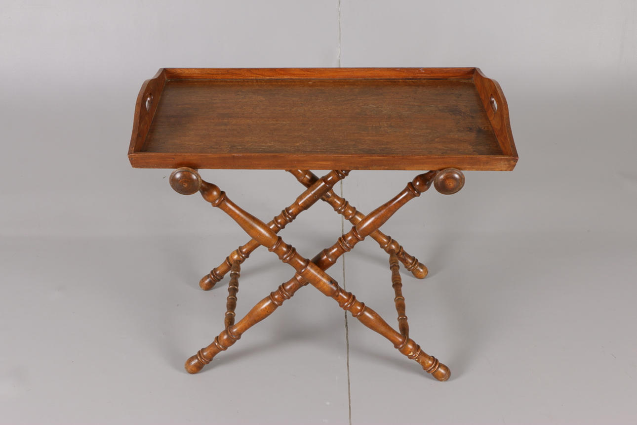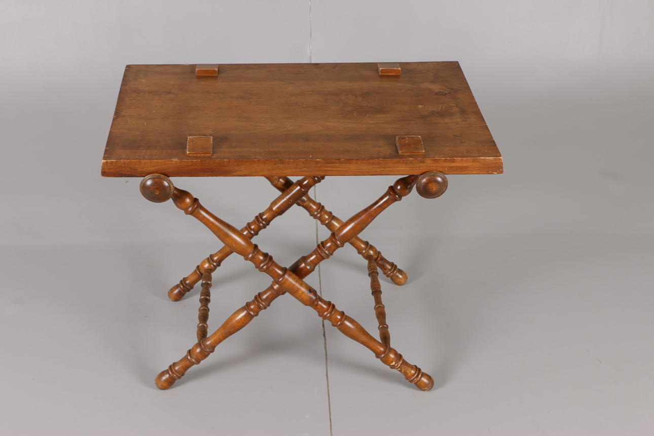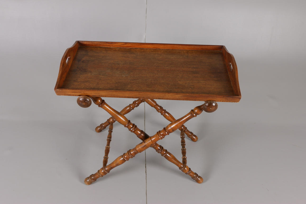Collapsible leg support with turned decor. Removable tray. Length 86.5, width 49, height 73.5 cm.