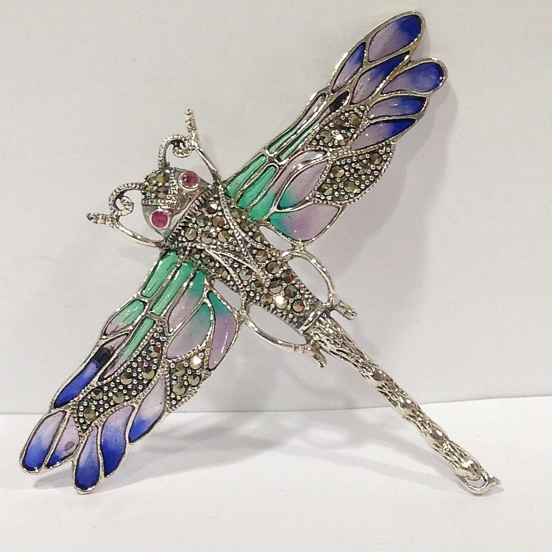 The wings of this dragonfly are inlaid with 3 colour enamelling and set with round marcasite stones.