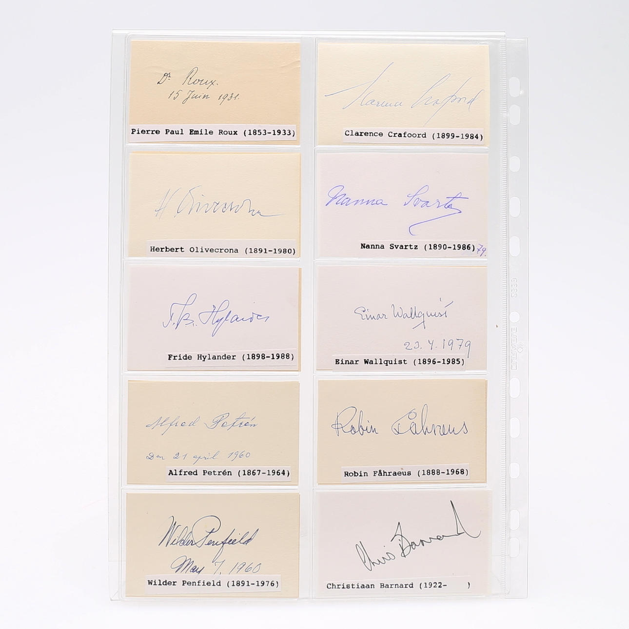 Gösta Forssell, SE Henschen, John Berg, Kjell Otto af Klercker, Hans Gertz, Tage Sjögren, HC Jacobaeus, Olof Kinberg, John Sjöqvist, Josua Tillgren, Pierre Paul Emilie Roux, Clarence Craaford, Herbert Oliviecrona, Nanna Svartz, Fride Hylander, Einar Wallquist, Alfred Petrén, Robin Fåhraeus, Wilder Penfield, Christian Barnard, Axel Höjer, Hermengildo Arruga, Joaquin Barraquer, Alfredo Munos, Björn Floderus, richard Erhardt, Jerzy Einhorn, Rutger Lagercrantz- measures 9 cm. x 5.5 cm. + Gunnar Holmgren on larger paper. Provenance: Sverker Hiort of Ornäs autograph collection.