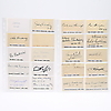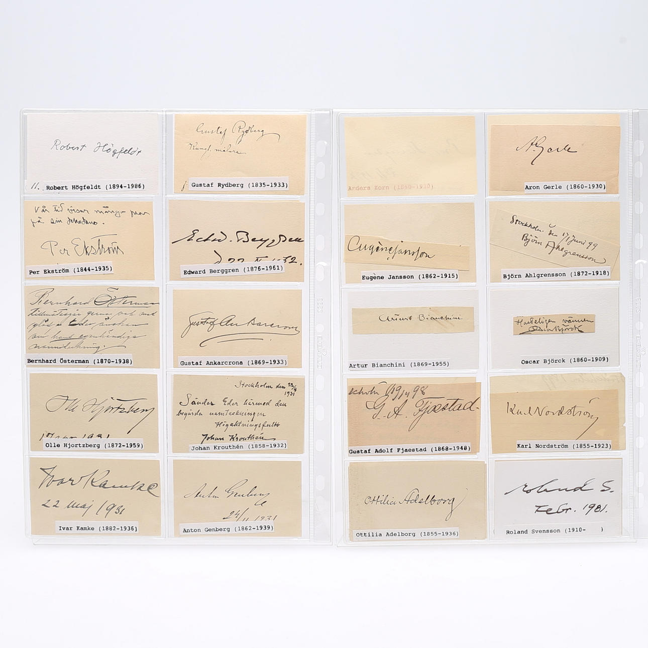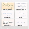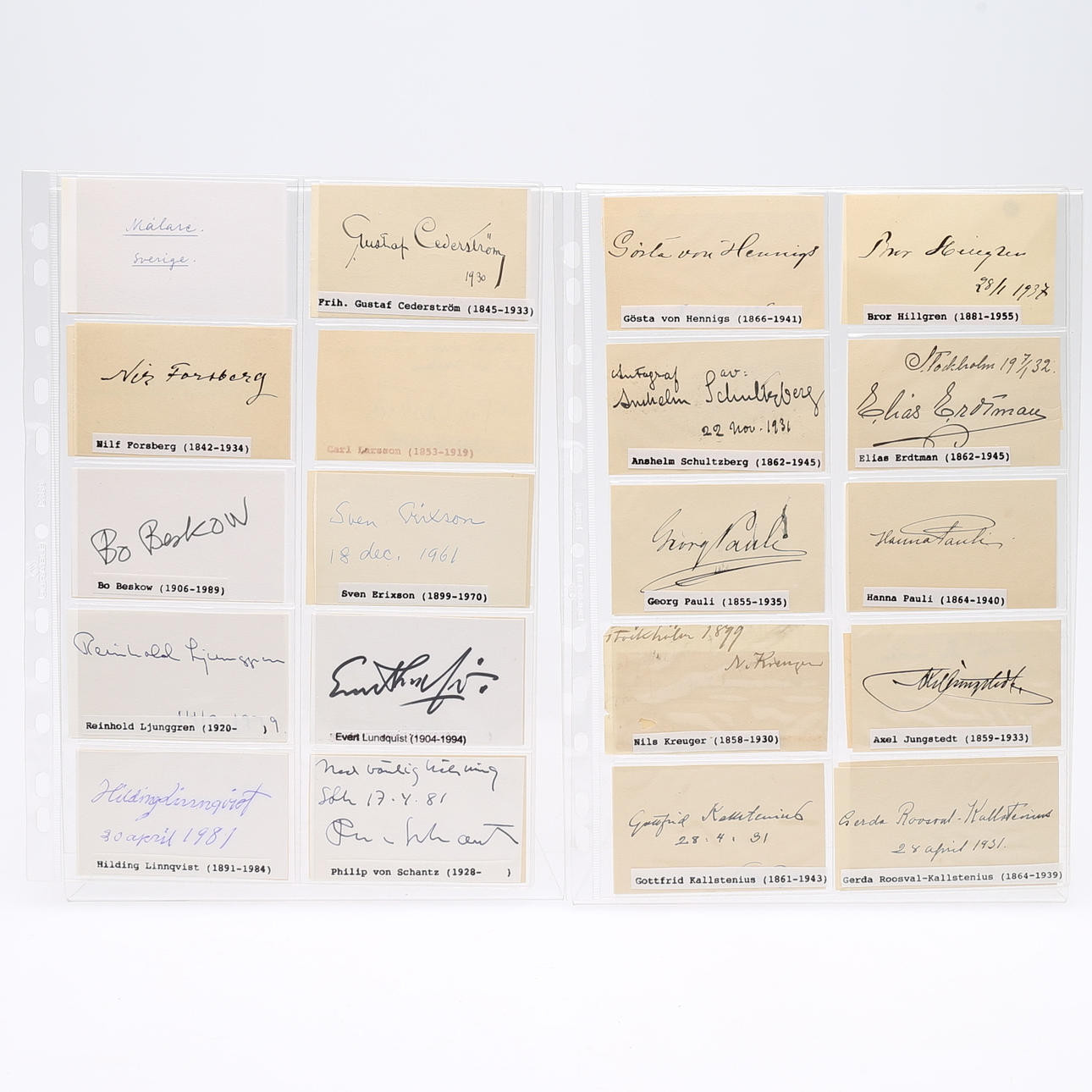 Gustaf Cederström, Nils Forsberg, Bo Beskow, Sven Erixon, Reihold Ljunggren, Evert Lundqvist, Hilding Linnqvist, Philip von Schantz, Robert Högfeldt, Gustav Rydberg, Per Eksström, Edward Berggren, Bernhard Österman, Gustav Ancarkrona, Olle Hjortzberg, Johan Krouthén, Ivar Kamke, Anton Genberg, Gösta von Hennings, Bror Hillgren, Anselm Schultzberg, Elias Erdtman, George Pauli, Hanna Pauli, Nils Kreuger, Axel Jungstedt, Gottfrid Kallstenius, Gerda Roosval-Kallstenius, Aron Gerle, Eugen Jansson, Björn Ahlgrensson, Arthur Biancini, Oscar Björk, Gustaf Adolf Fjaestad, Karl Nordström, Ottilit Adelborg, Roland Svensson, Richard Berg, Göran Brunius, Gustav Rudberg, Zoia, Lennart Rodhe, Peter Dahl and Louis Sparre - measures 9 cm. x 20 cm. Provenance: Sverker Hiort of Ornäs autograph collection.