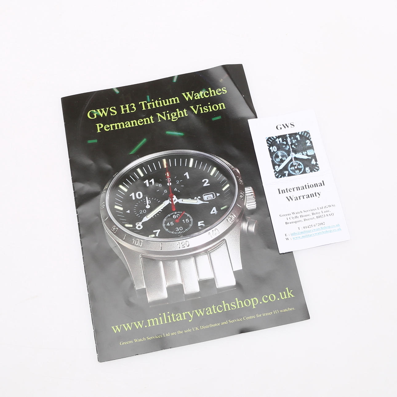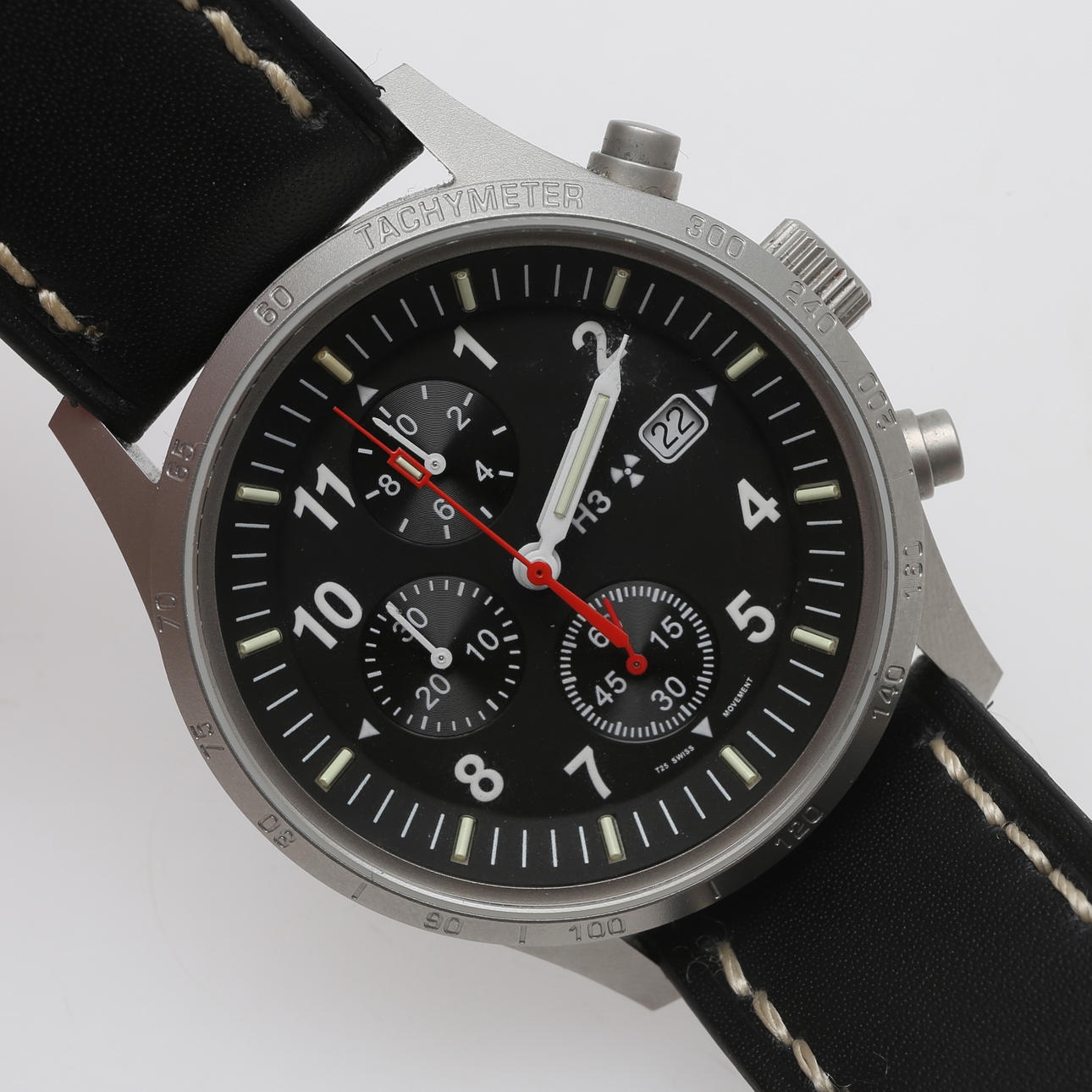 Quartz movement Ronda 3540B, steel case, sapphire crystal, case diameter approx. 40 mm, leather strap. Includes NATO strap and warranty card issued in 2014.
