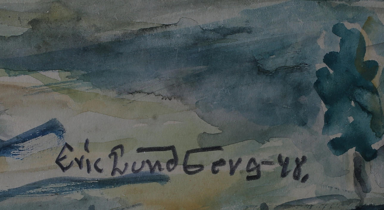 ERIC LUNDBERG. Watercolour, landscape with rainbow, signed and dated 48.