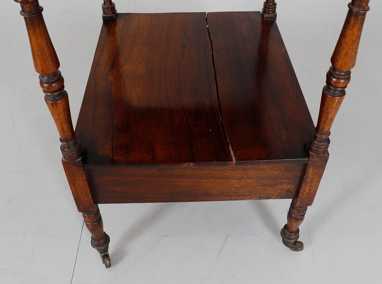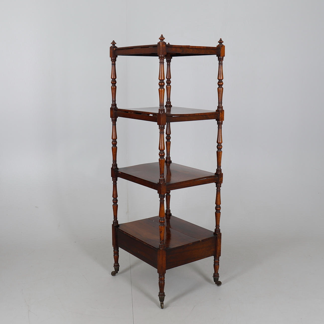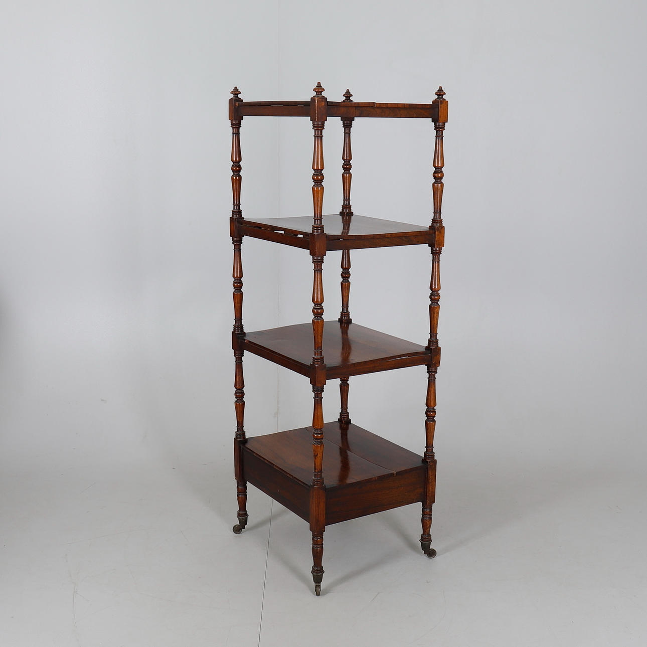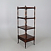 mid-19th century, four rectangular tiers within turned uprights, single drawer below, brass cappings and castors, 47.5cms wide, 135cms high, 41cms deep.