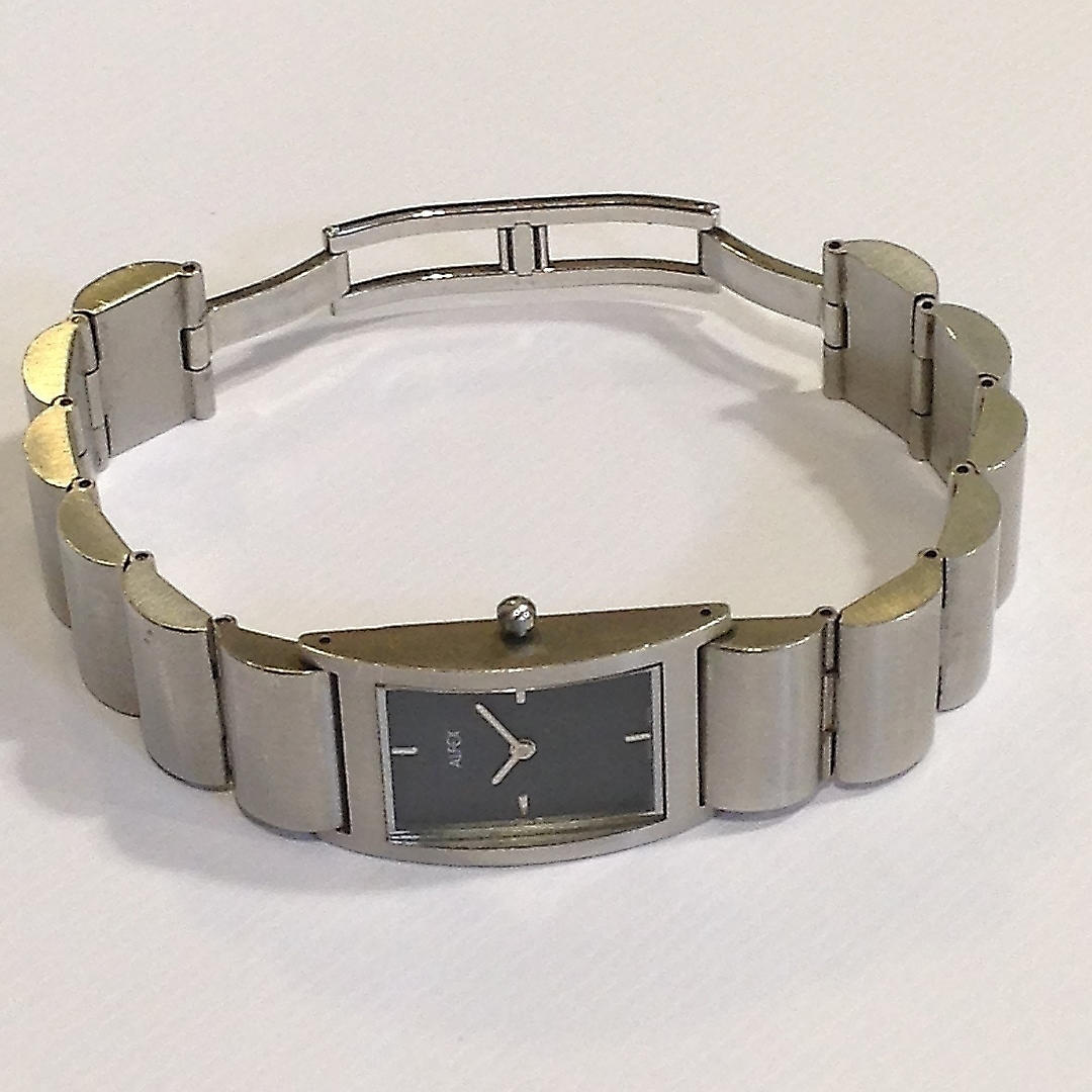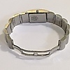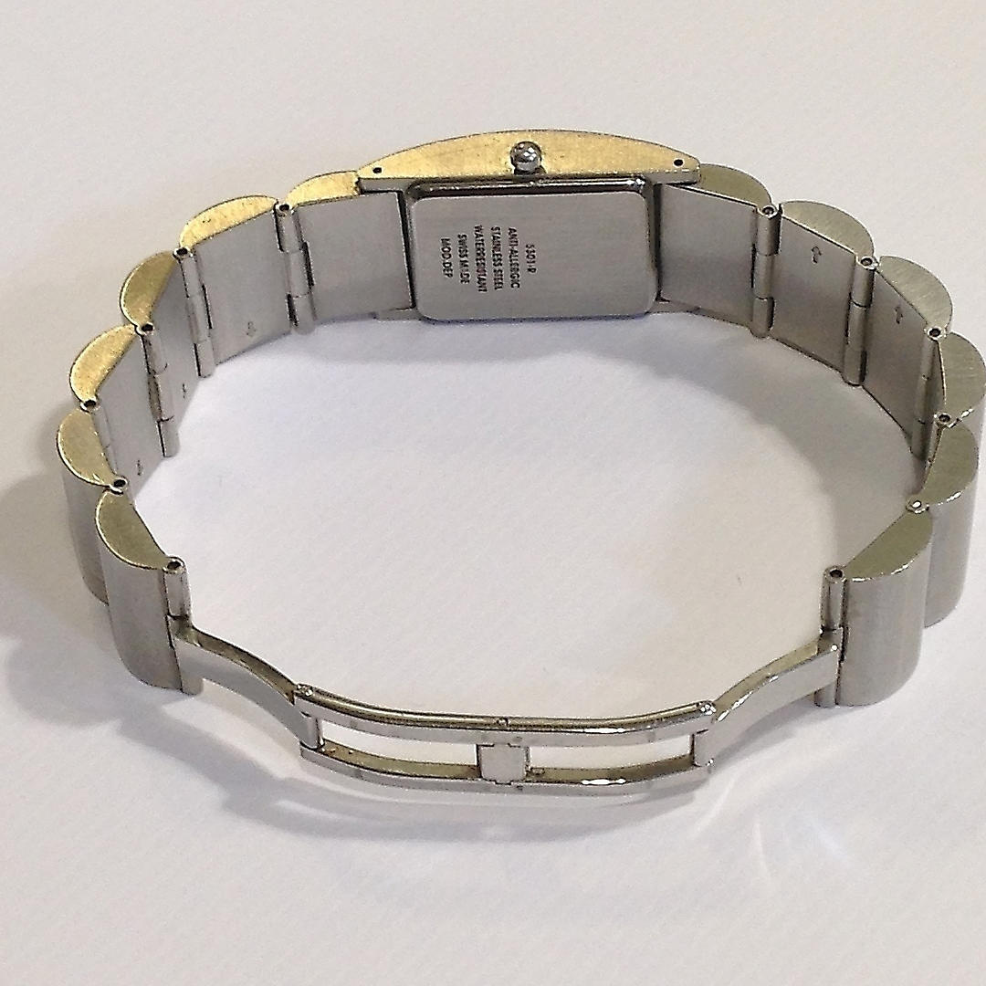 This watch is stainless steel and is powered by quartz movement. The bracelet fastens with a hidden clasp.
