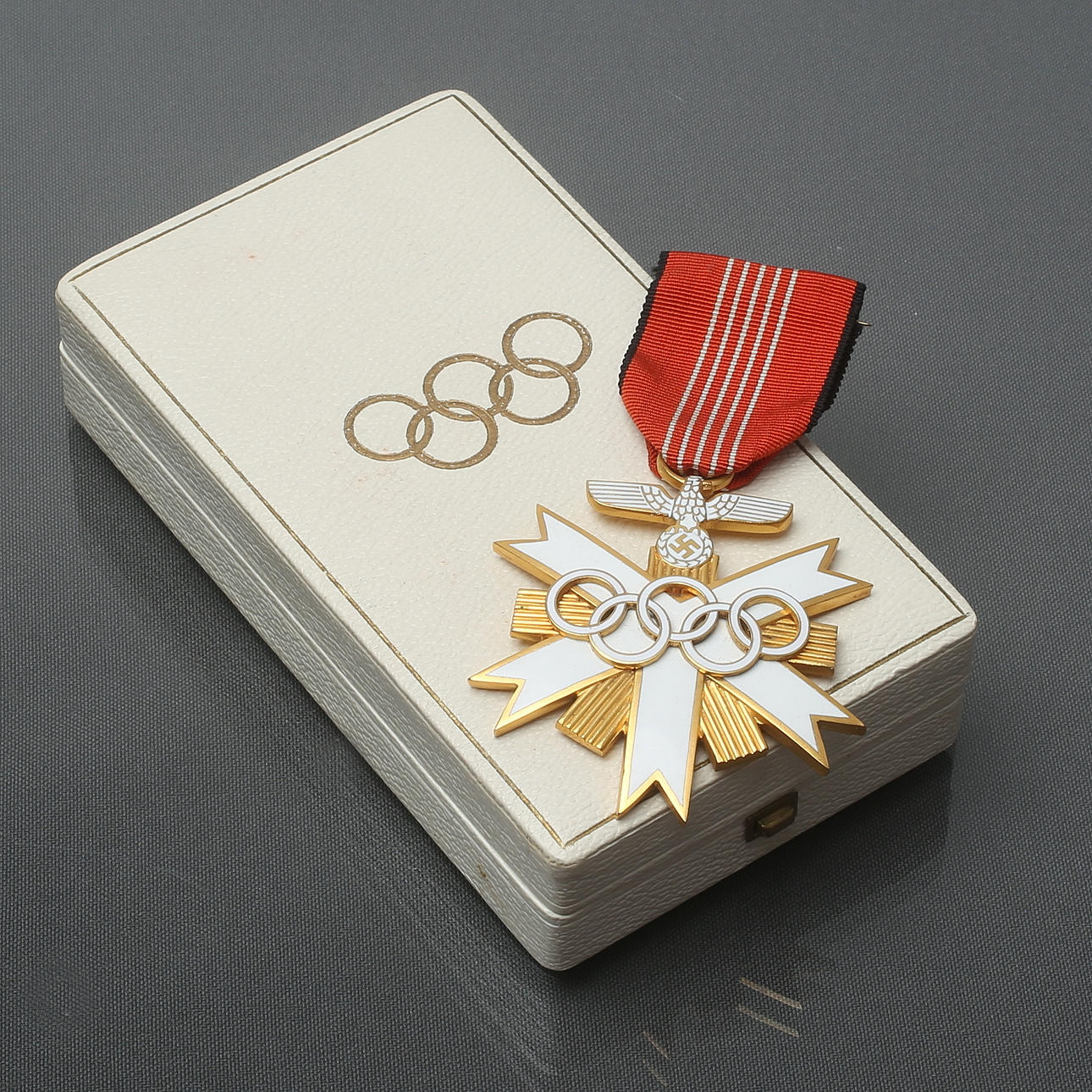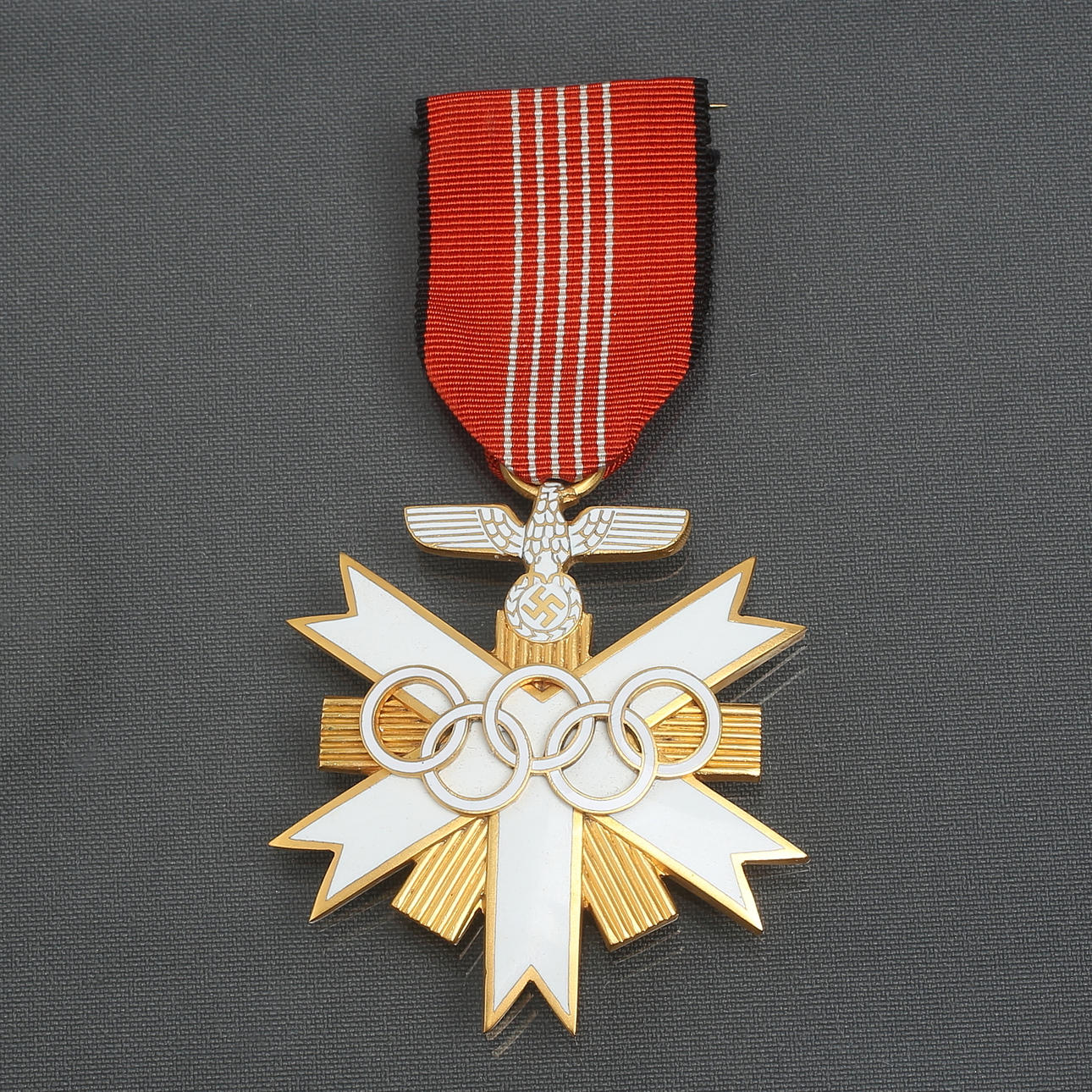 Brass with enamel decoration. Textile tape. With case. German Olympic badge of honor second class.