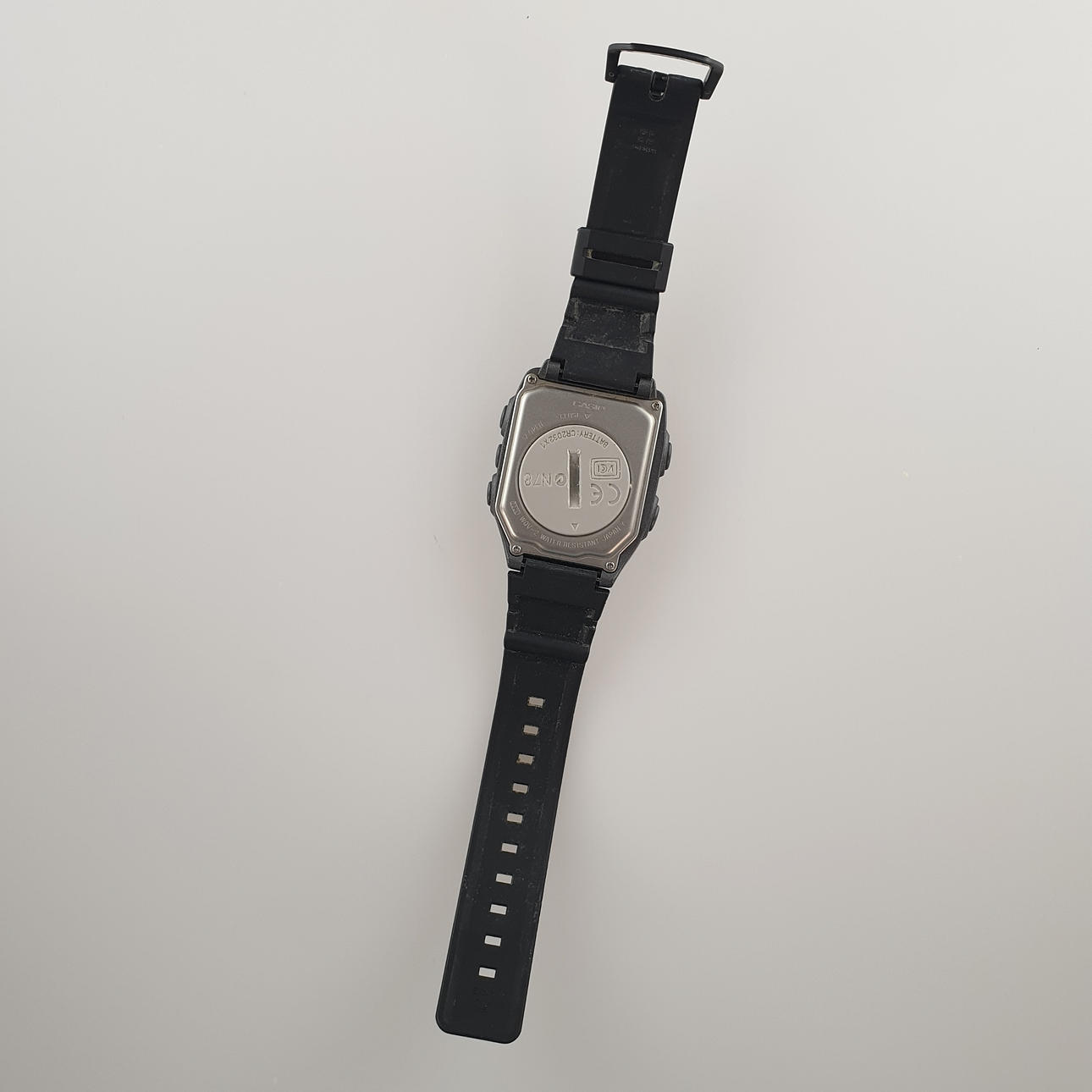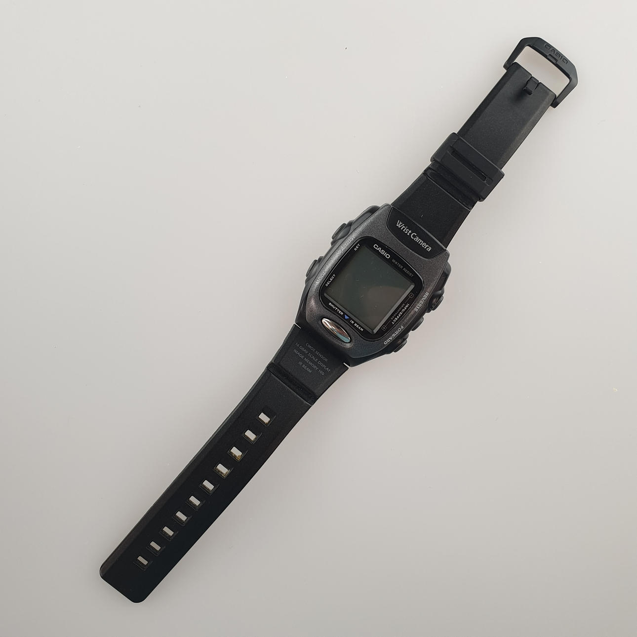 Casio Wrist Camera WQV-2 2220 - digital, alarm, date display, stopwatch, plastic/metal housing, waterproof, CMOS sensor, 16 gray scale screen, image memory 100 pieces, infrared radiation, housing approx. 52x38mm; Black plastic strap, function not tested.