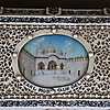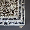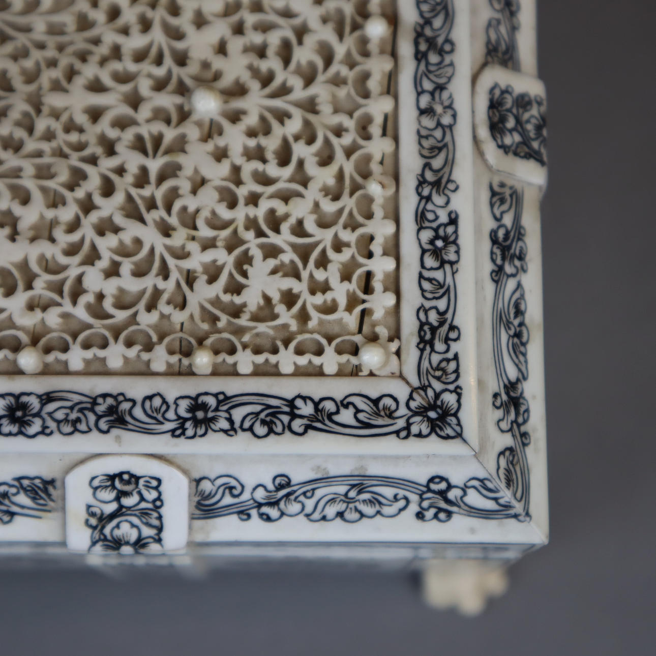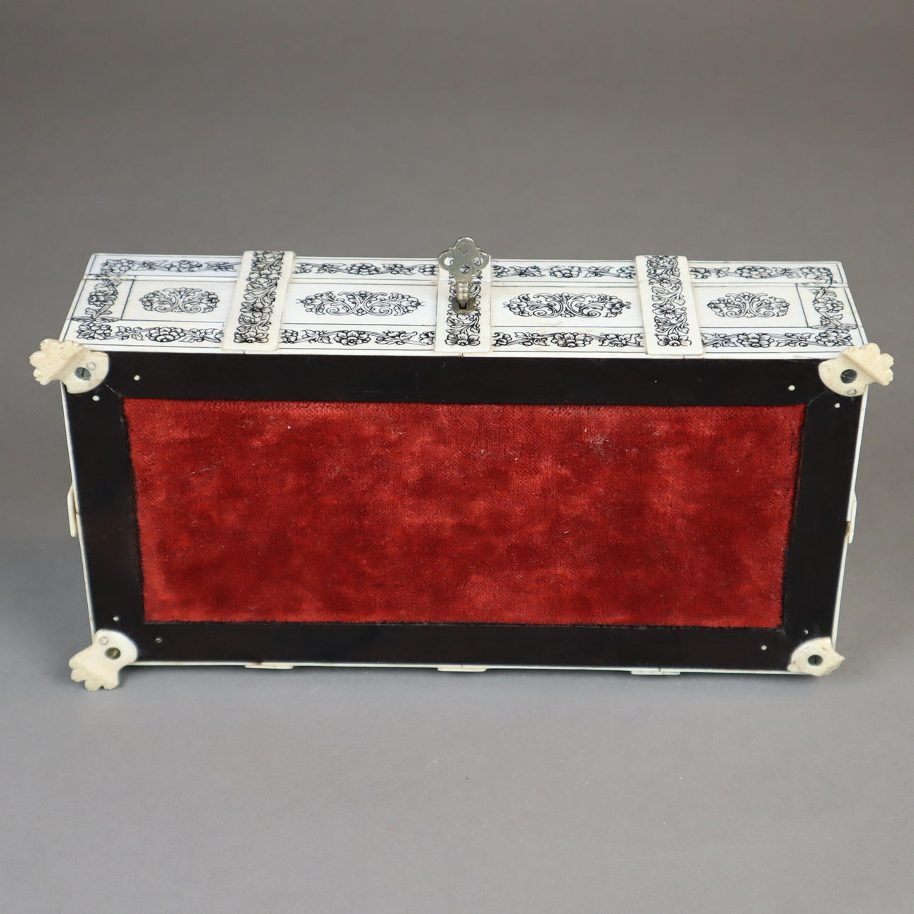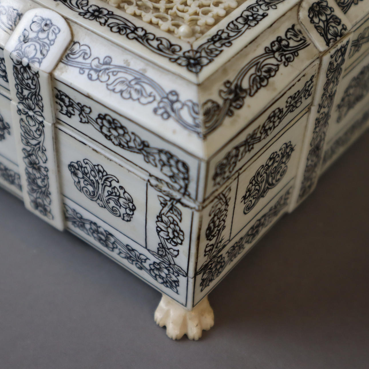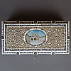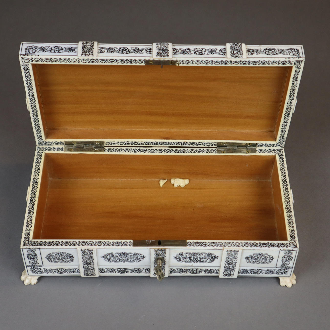 Box - India around 1900, rectangular wooden body with ivory veneer on four paw feet, all sides engraved and blackened floral decoration, hinged lid with filigree carved tendril decoration, in the center an oval medallion with fine polychrome miniature painting "Pearl Mosque Delhi", lockable, key available, HxWxD: approx.7 .5x20.5x11.5cm.