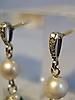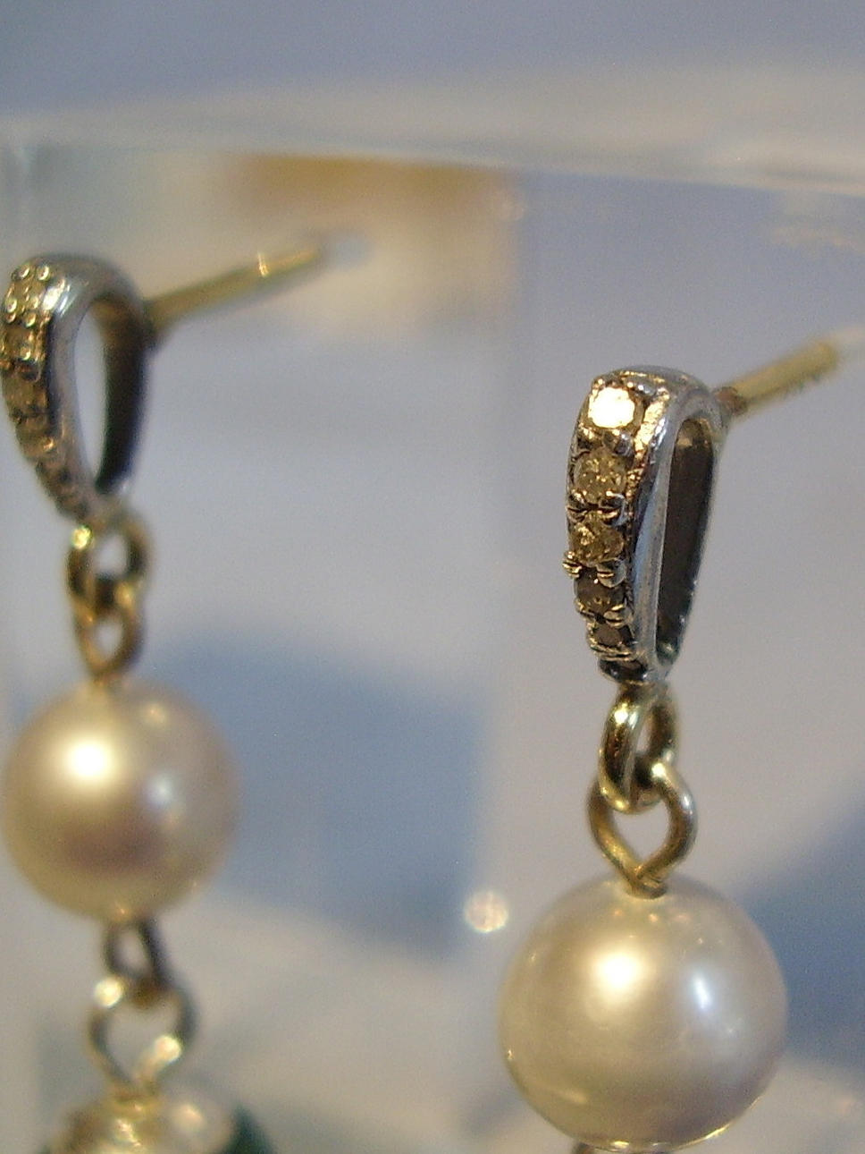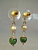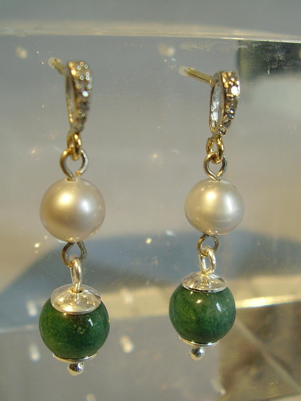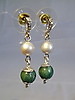 Earrings length 3 cm, emerald beads 7.5 mm in diameter, cultured pearls 6.3 mm in diameter, weight 3.3 grams.