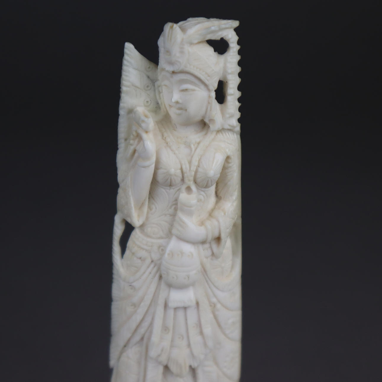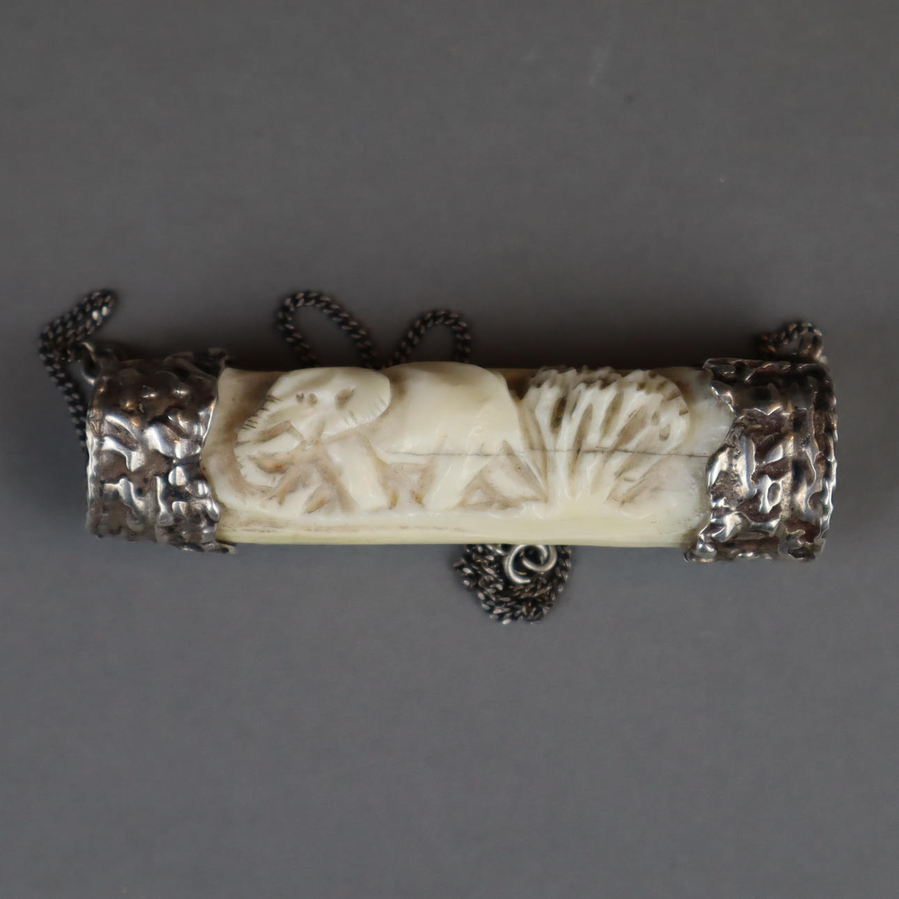 Two ivory carvings - 1x female figurative plastic, India, 19th century, ebonized wooden base, H. without base approx. 13.2cm; 1x pendant on a silver chain, ivory body with a carved elephant, silver fittings, stamped 925, 1920s/30s, L.ca.8.2cm, L.with chain ca.50cm.