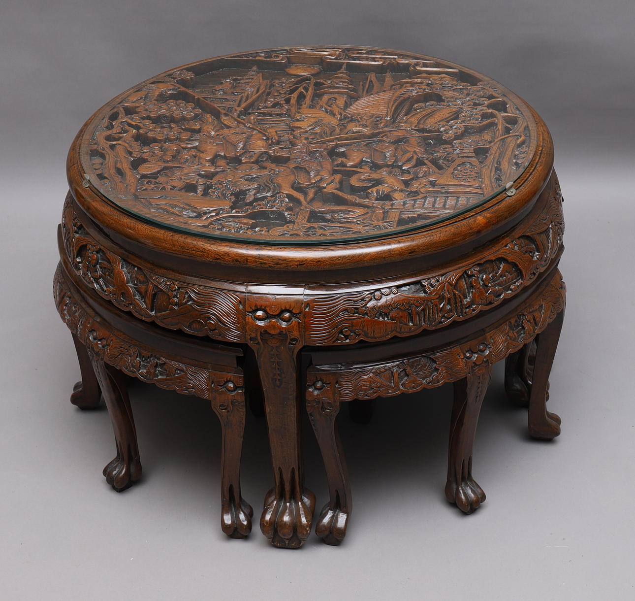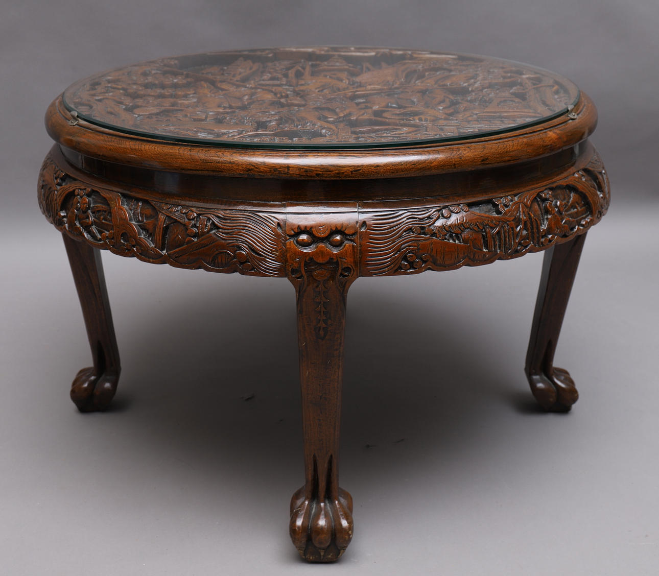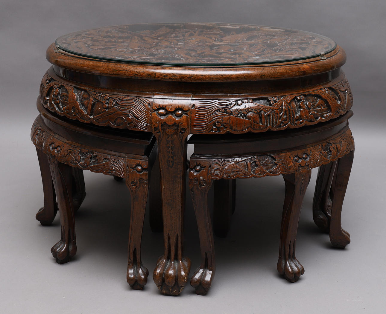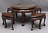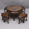 1173668. TABLE with stools, carved wood, glass top.