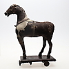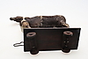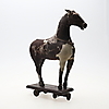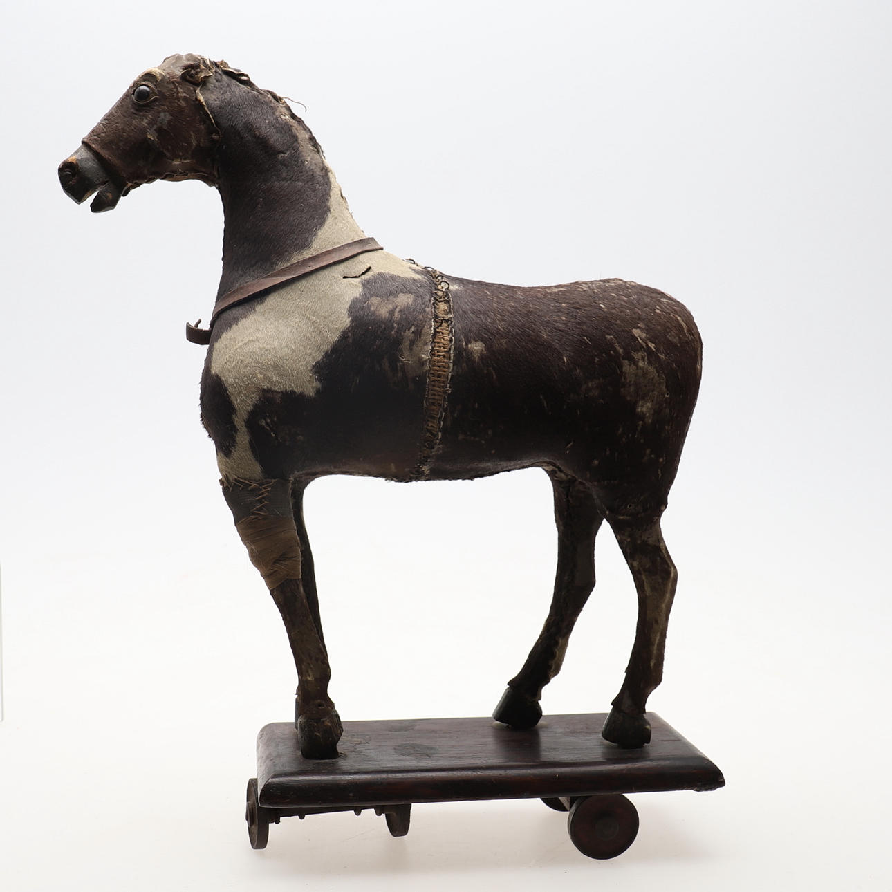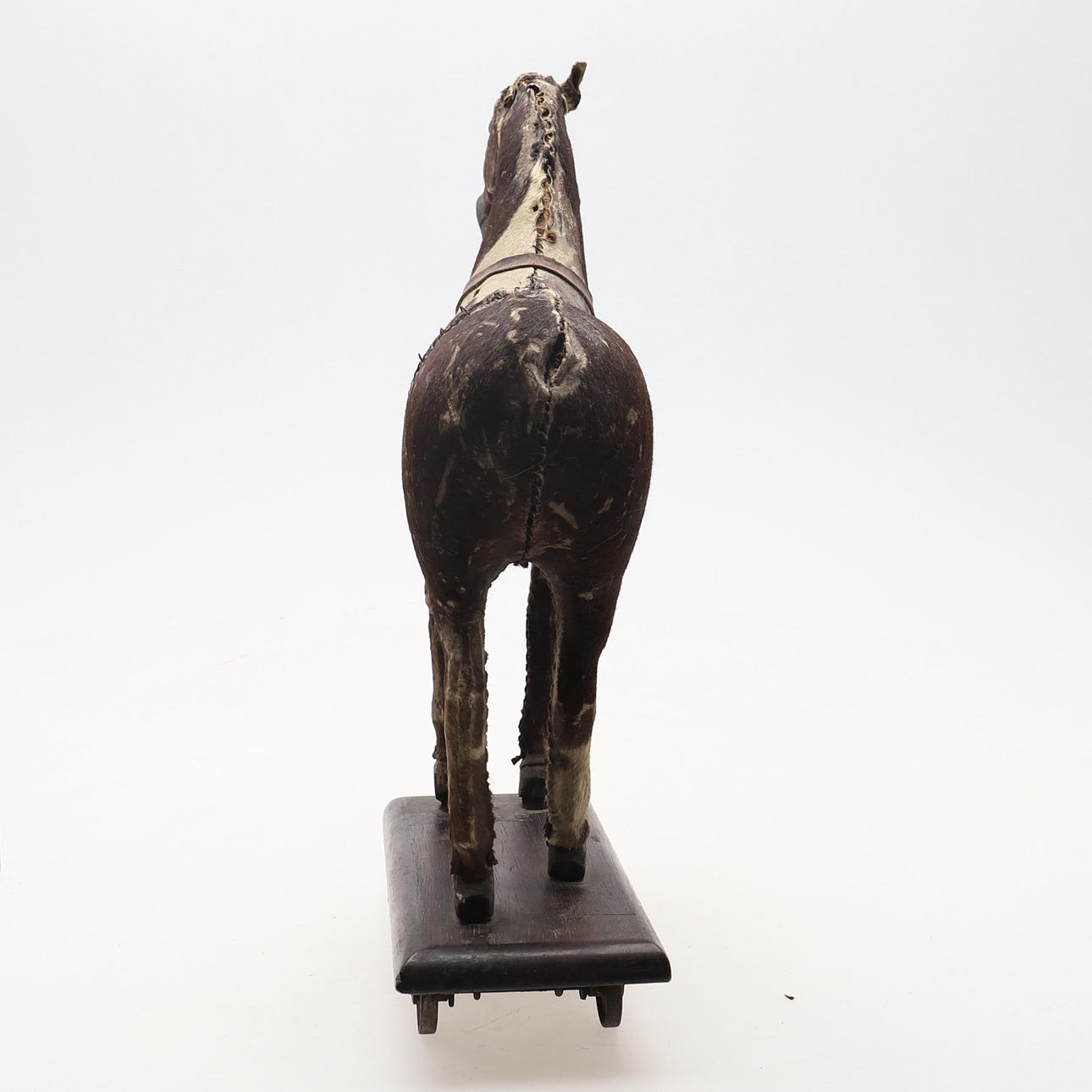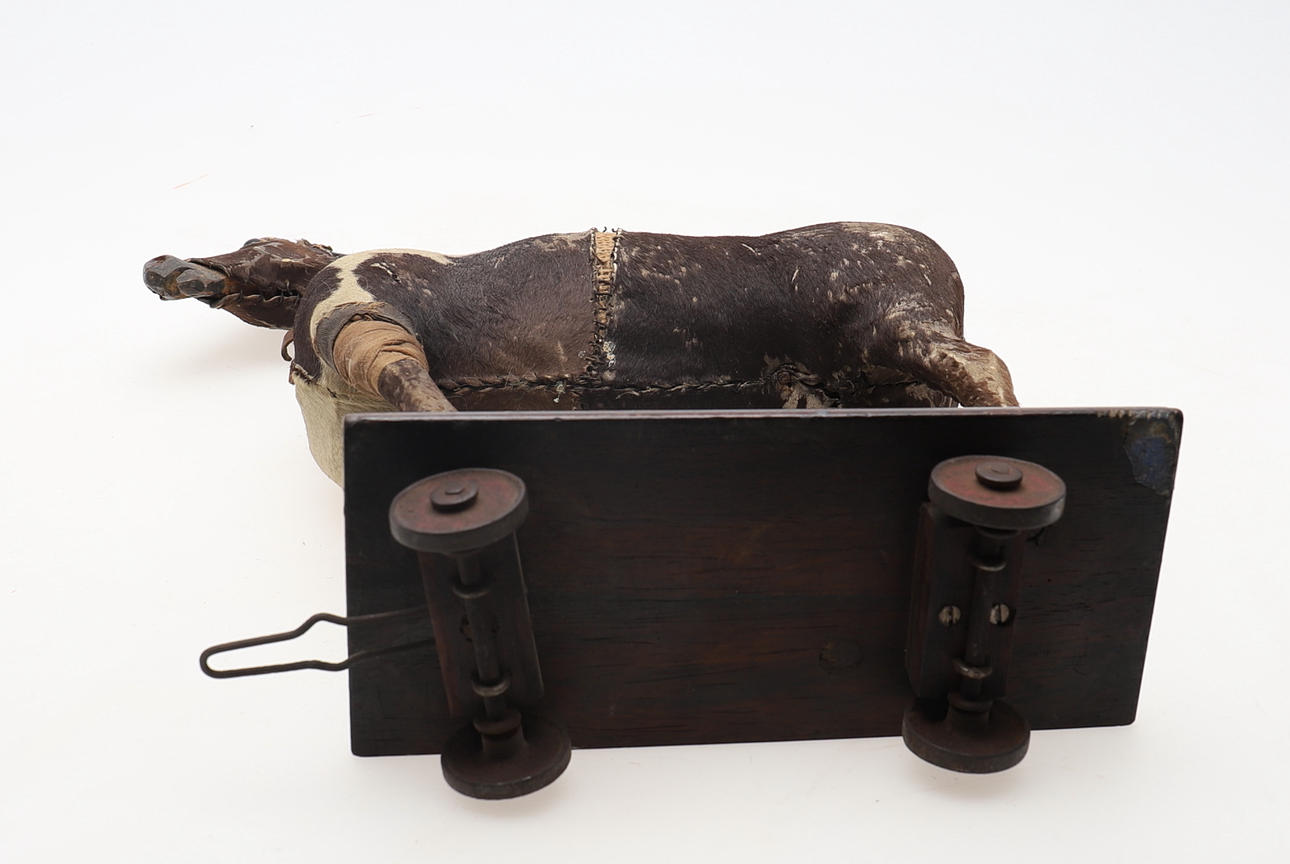 probably late 19th century, with hand-stitched pony skin on a carved wood frame, eyes, wooden base and wheels, 42cms high (a/f).