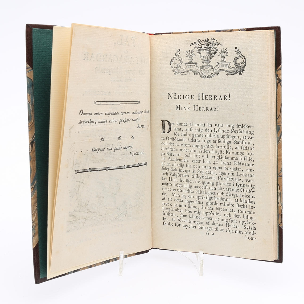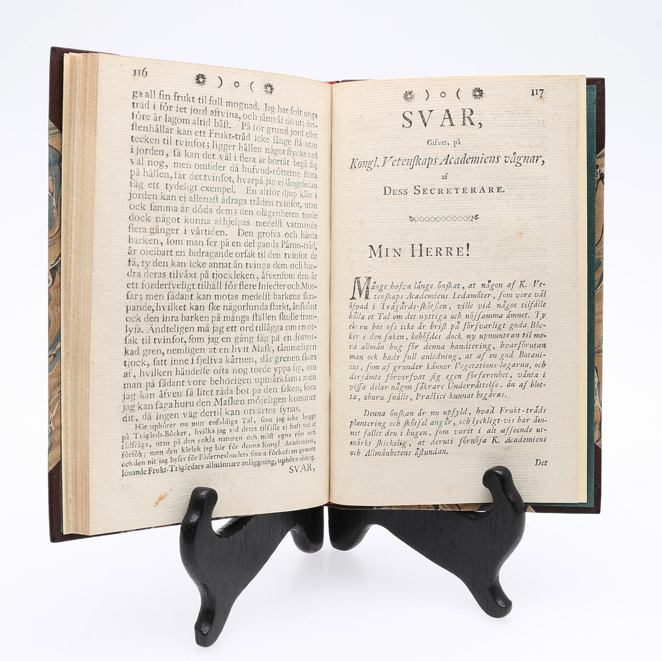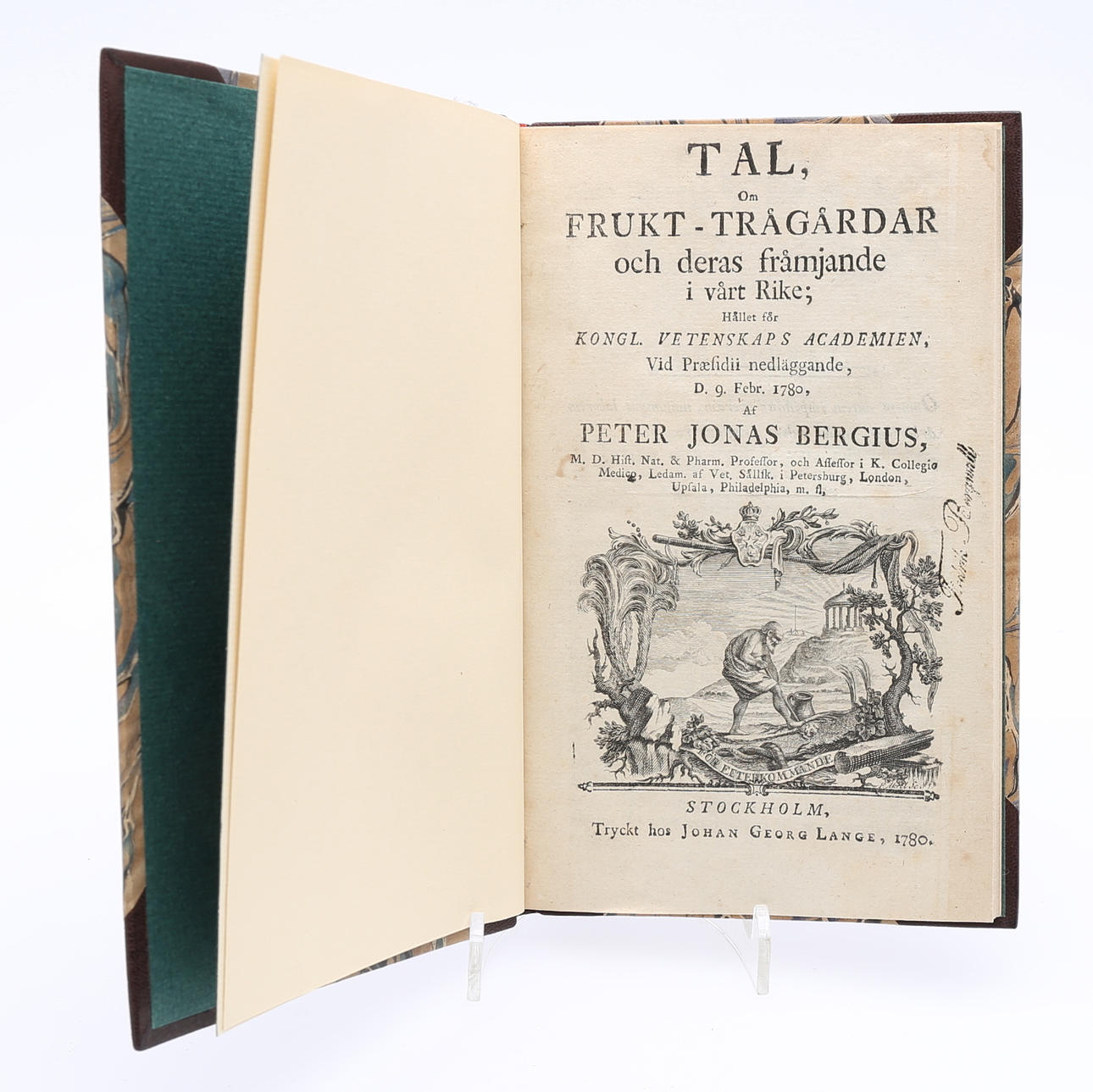 Bergius, Peter Jonas. Talk about orchards and their promotion in our Kingdom. Held for the King. Science Academy D. 9 Feb. 1780. Johan Georg Lange, Stockholm, 1780. 8vo in a later well-bound half morocco binding with gilt spine text and marbled covers. The title page with the engraved vignette of the Academy of Sciences with the text "For posterity." 118 p.