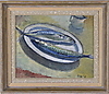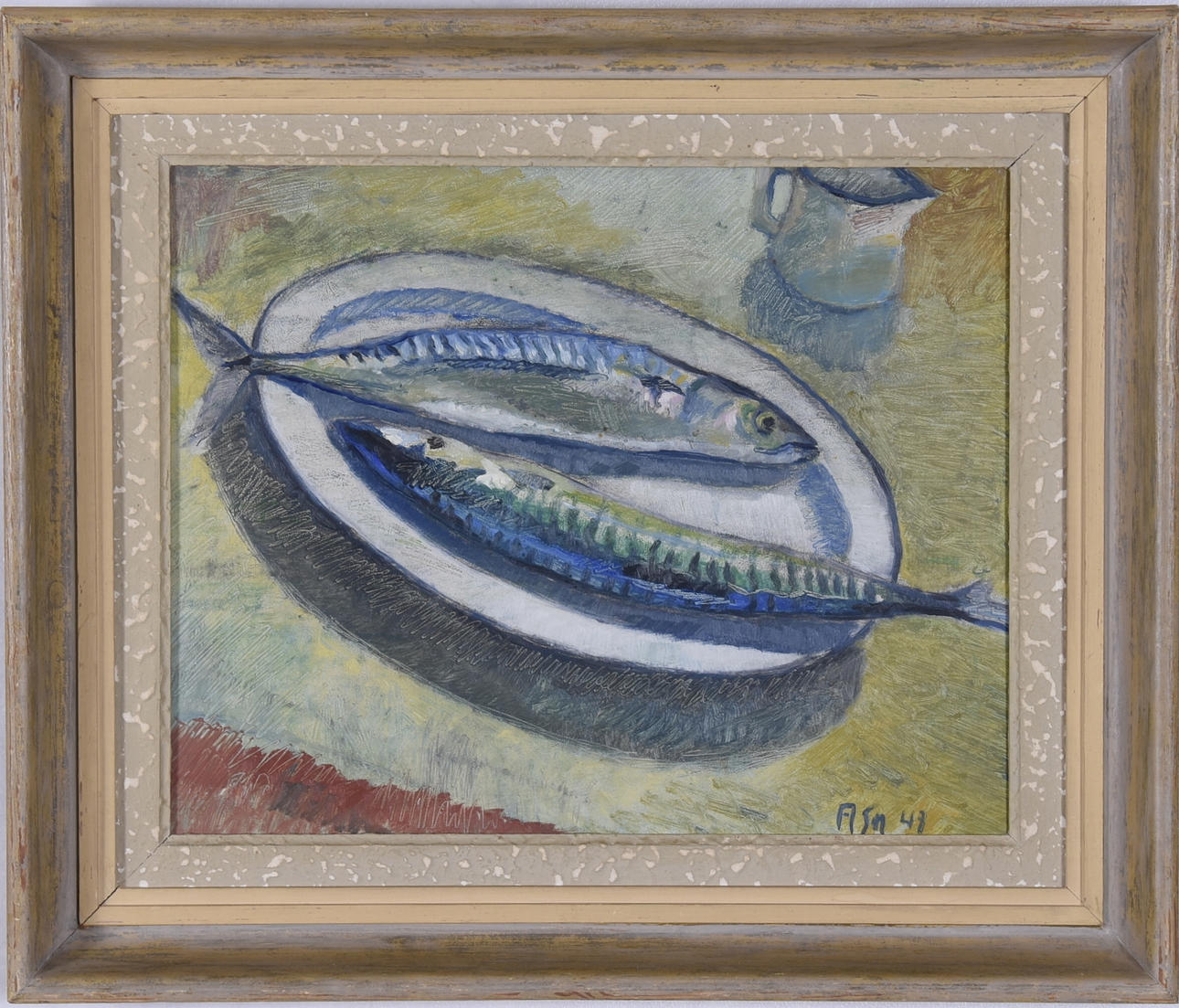 Still life with mackerel. Signed and dated -47. 33x41 cm.
