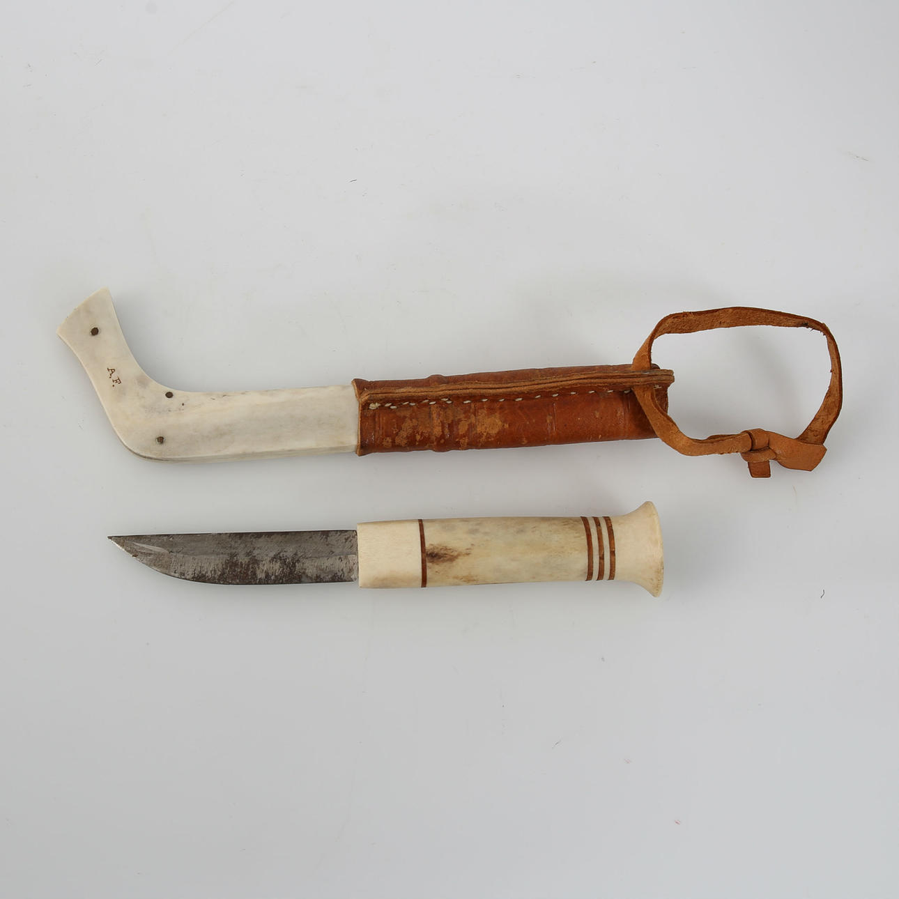 1199425. SAMEKNIFE, horn and leather, Anders Fankki, monogram signed.