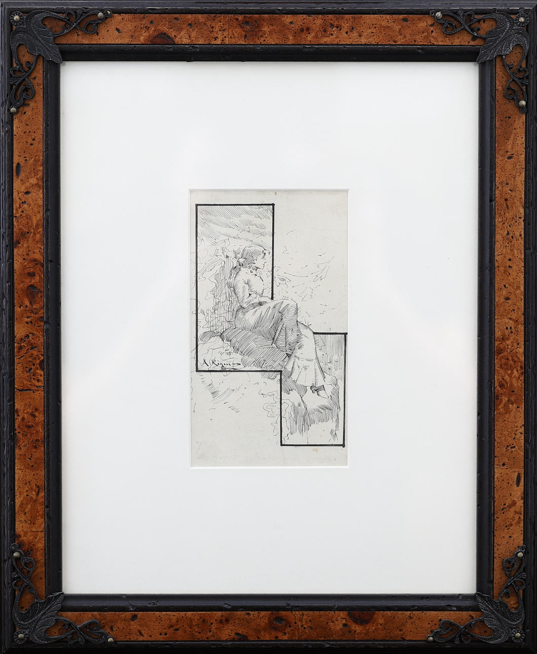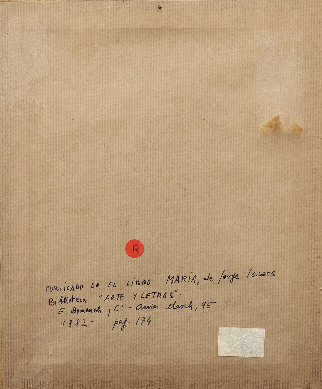 Ink drawing on paper Signed. Literature: Jorge Isaacs, “María. Novela americana”, Barcelona, Maucci, s. f., p. 174 (reproduced) 14x8.5 cm.