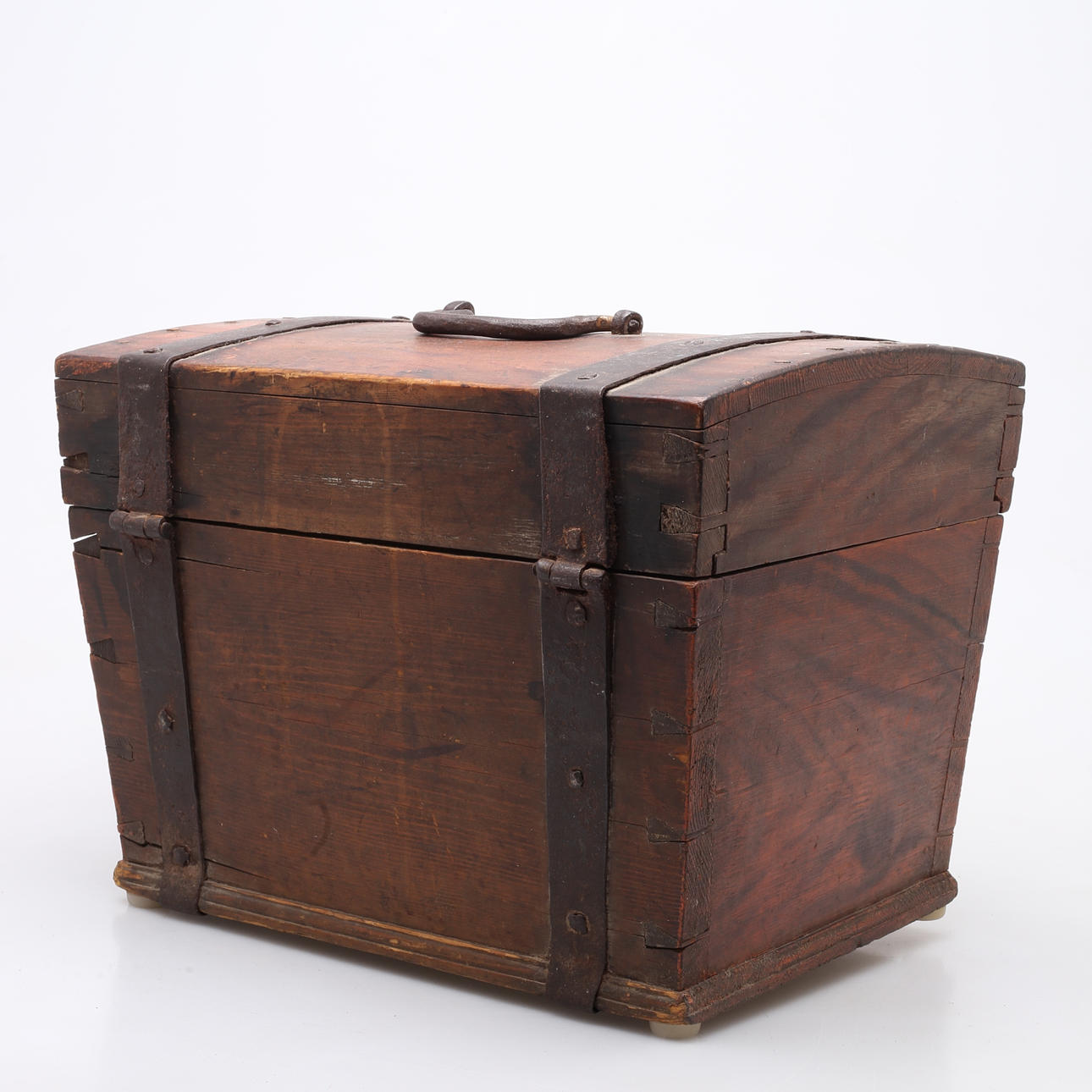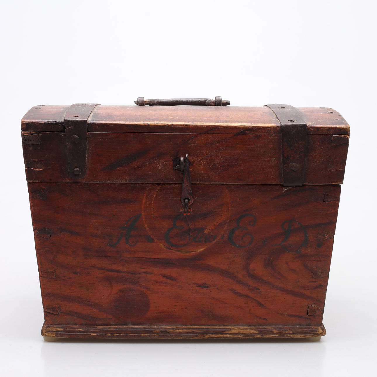 Chest, early 19th century, grain-painted pine, iron fittings, front with owner's monogram, approx. 35x25 cm, height 26 cm.