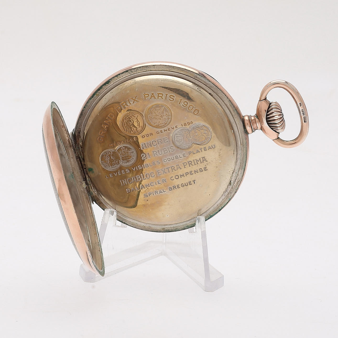Outer case marked Swissmade 9678860 Inner case marked Grand Prix Paris 1900, Médaille dor Genève 1896. Levees Visibles Double Plateau. 21 Rubis. Incabloc Extra Prima. Balancier Compensé. Spiral Brequet, 9678860.
