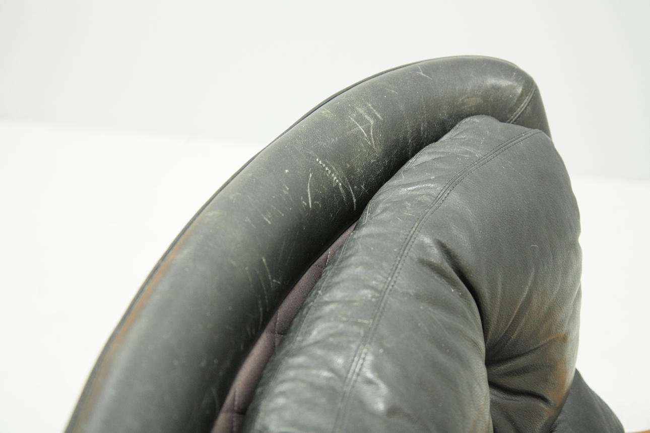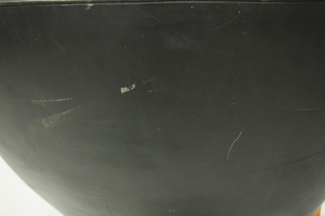 Height 93, width 76, depth 83 cm. Marked Bröderna Andersson Industrier i Ekenässjön AB. Leather and teak.