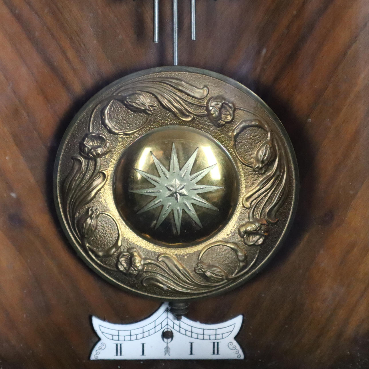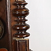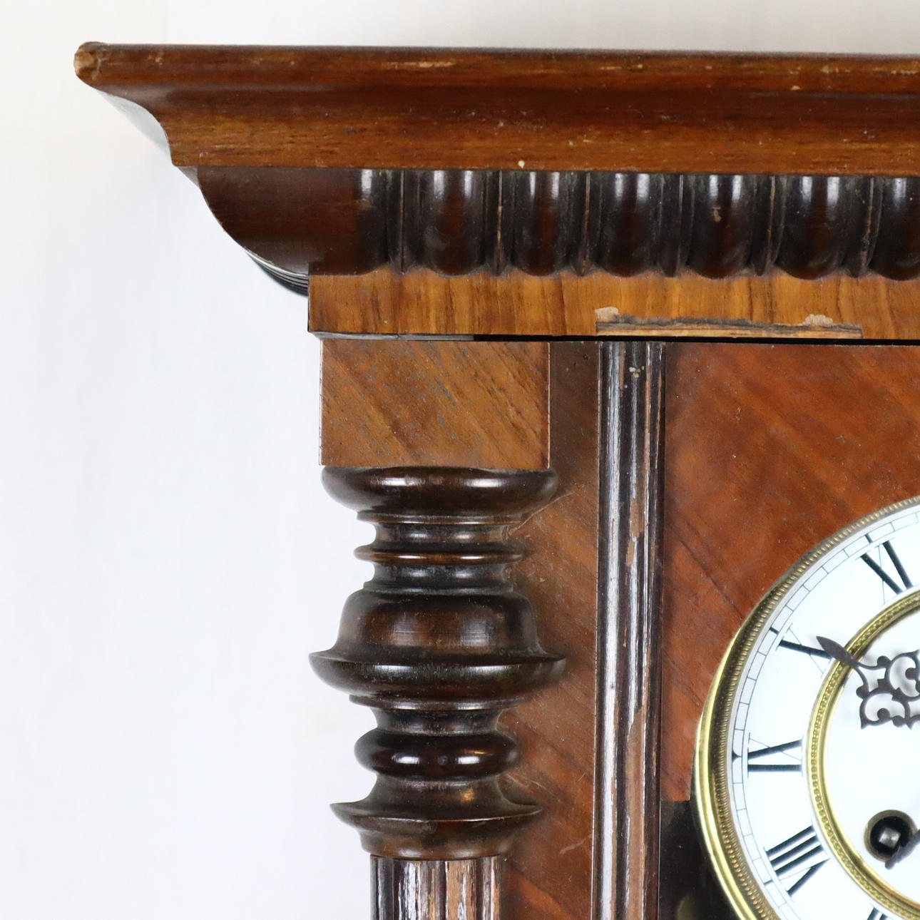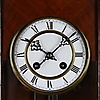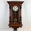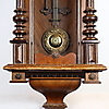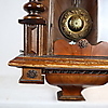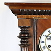 Wooden case with semi-columns on the side, partly turned and carved, glazed on 3 sides, white enamel dial with black Roman numerals, metal plaque with monogram "GWV", pendulum with floral Art Nouveau decor, strike on clay spiral, key available, H.ca.74x42x21cm.