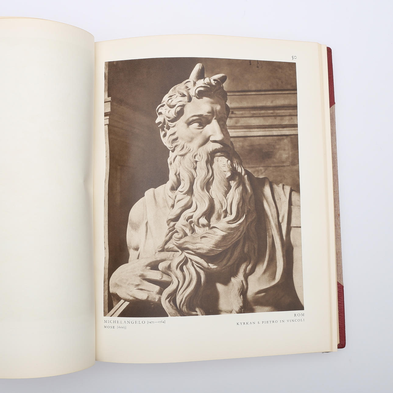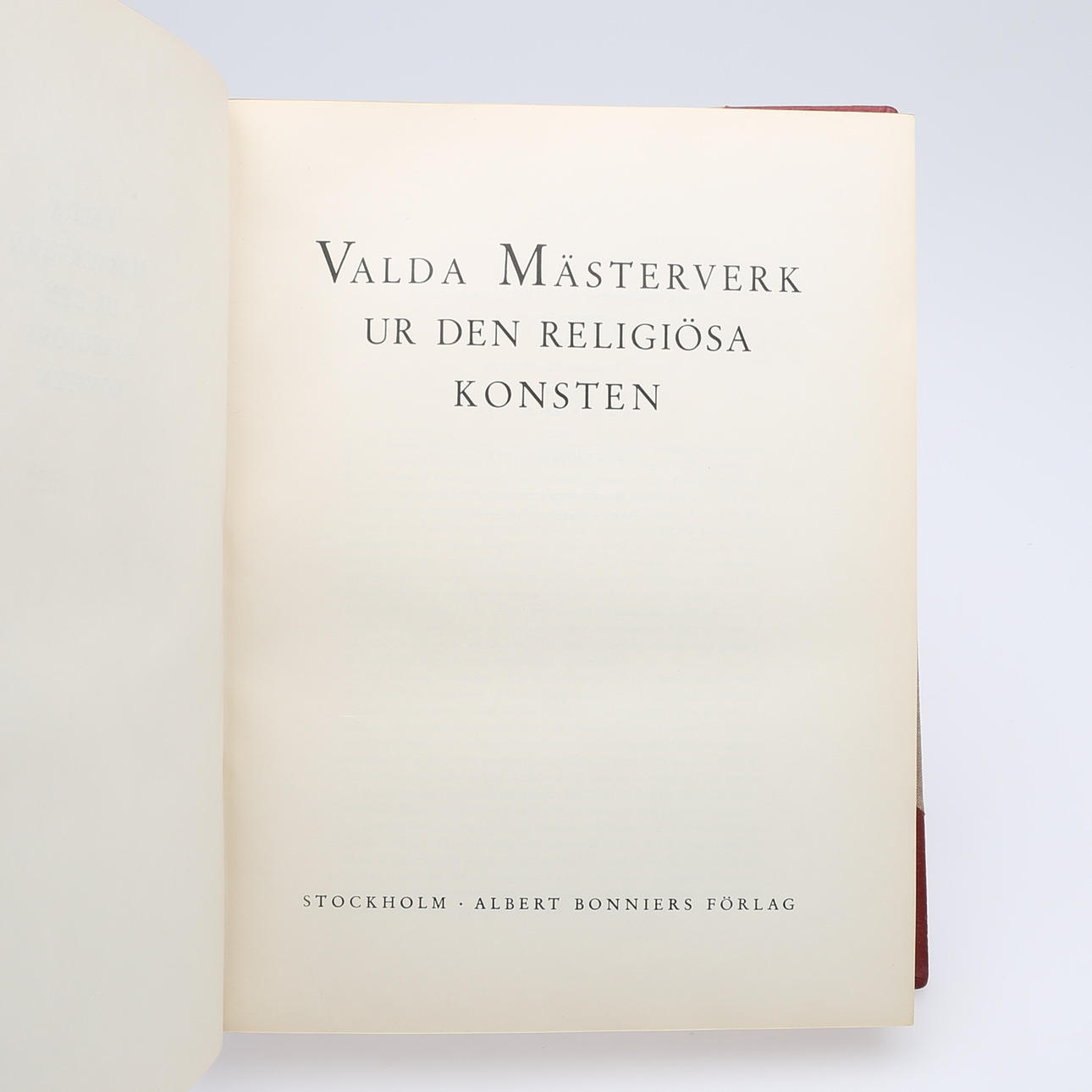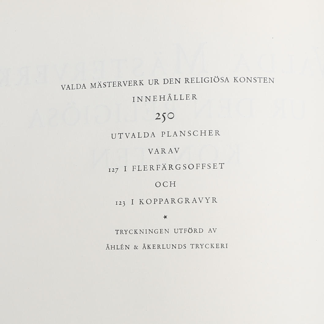 Art. Selected masterpieces from religious art. Albert Bonnier's publisher, Stockholm, 1948. Contains 250 plates of which 127 in multi-colour offset and 123 in copperplate printing. Folio in a red half morocco binding with gilt spine text and gilt spine decoration. Upper gold cut.