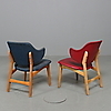 Armchairs, 3 pcs. "Winnie", IKEA, 1950s, one dressed in red lace, the other two with textile upholstery, H 74 cm, W 54 cm, seat height 39 cm.