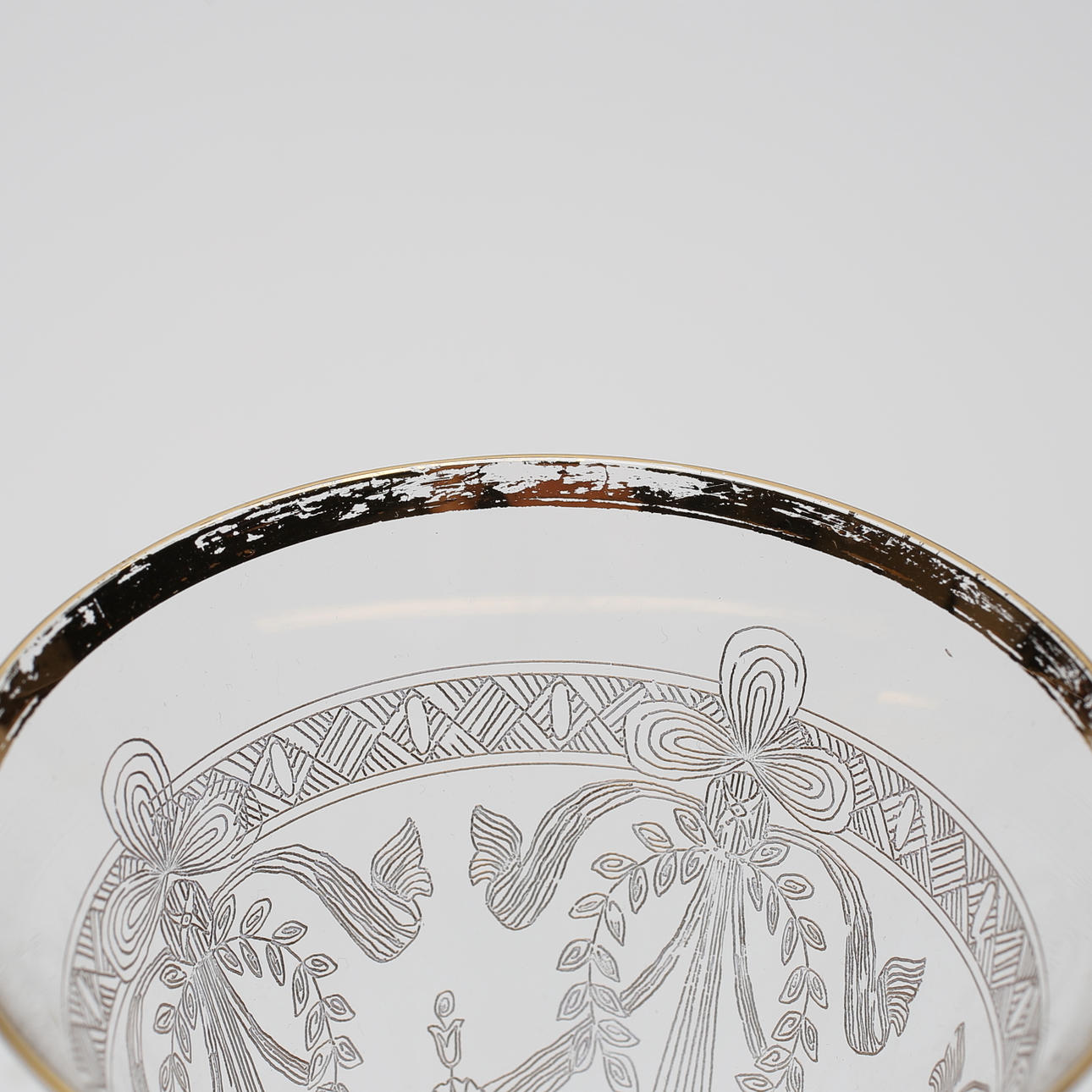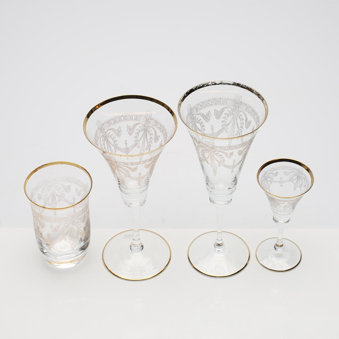 Normal wear and tear. Some with wear on the gold edge, mainly on the champagne glasses.
