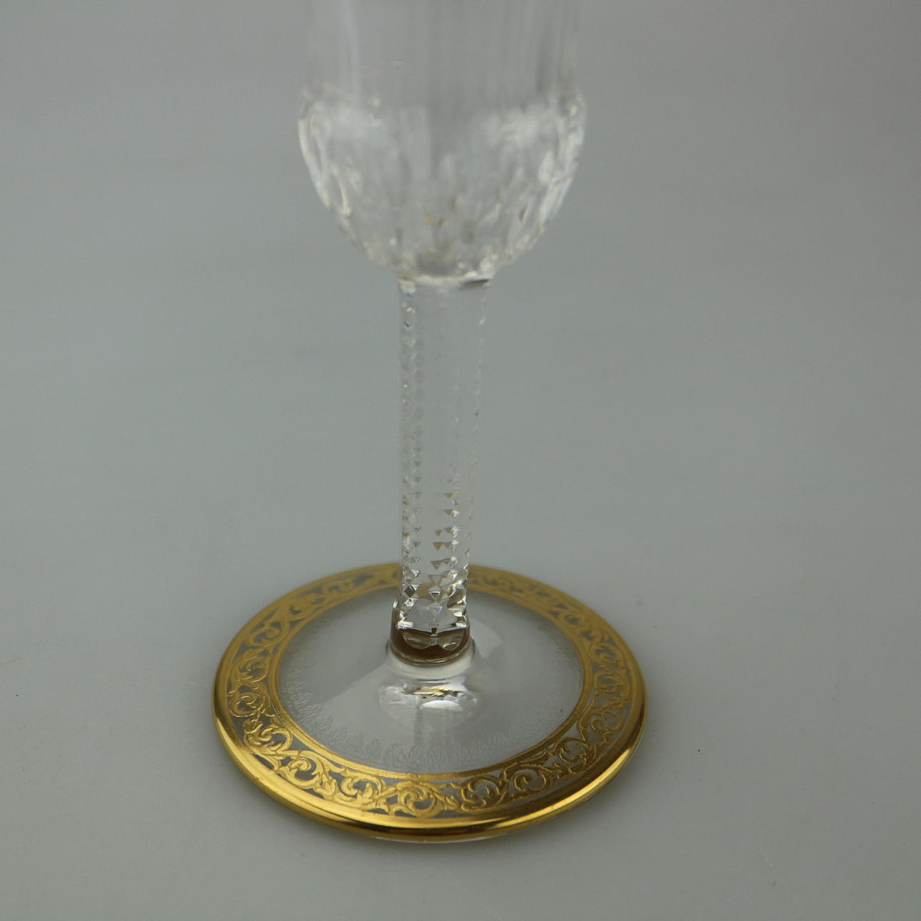Walls with rims, borders made of the finest gold applied with a brush, burned and polished with agate stones, matt etched leaf borders and acanthus leaf pendants, base with large, shaft with small notched cuts, stand with etched mark Cristal Saint-Louis, France, 2. half 20 Century, "Thistle" model, designed around 1913 Height: 19 cm.
